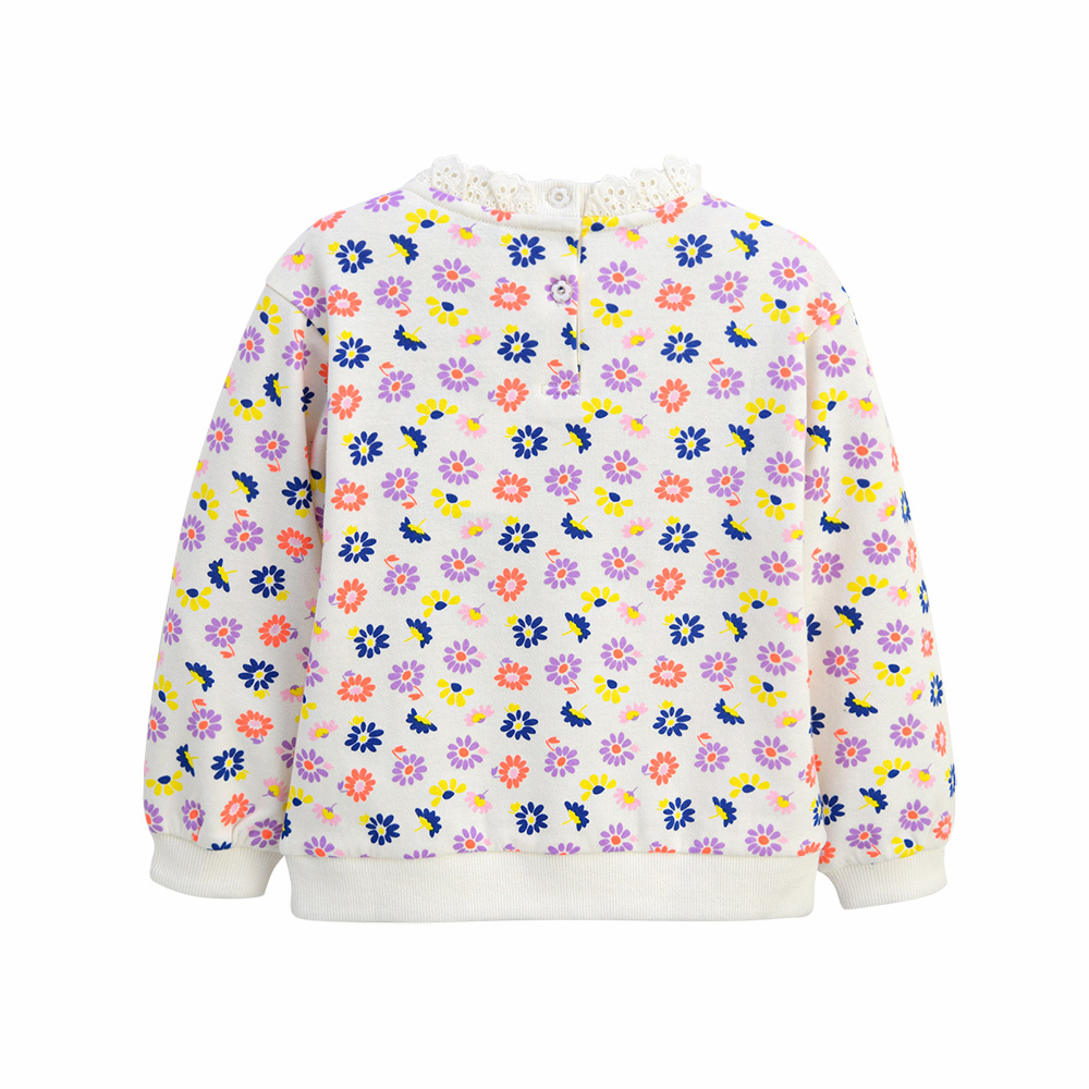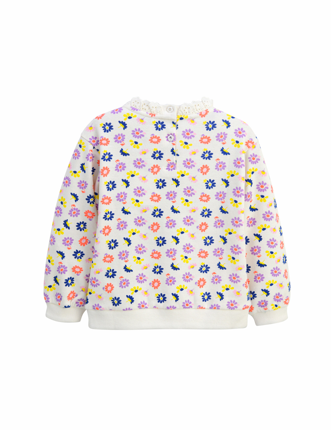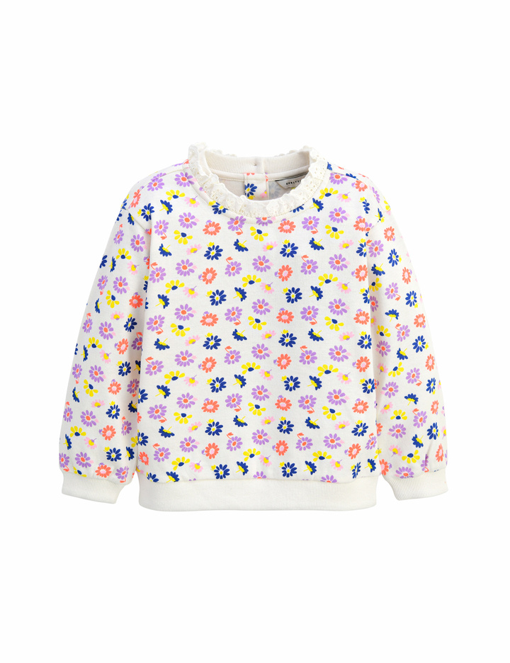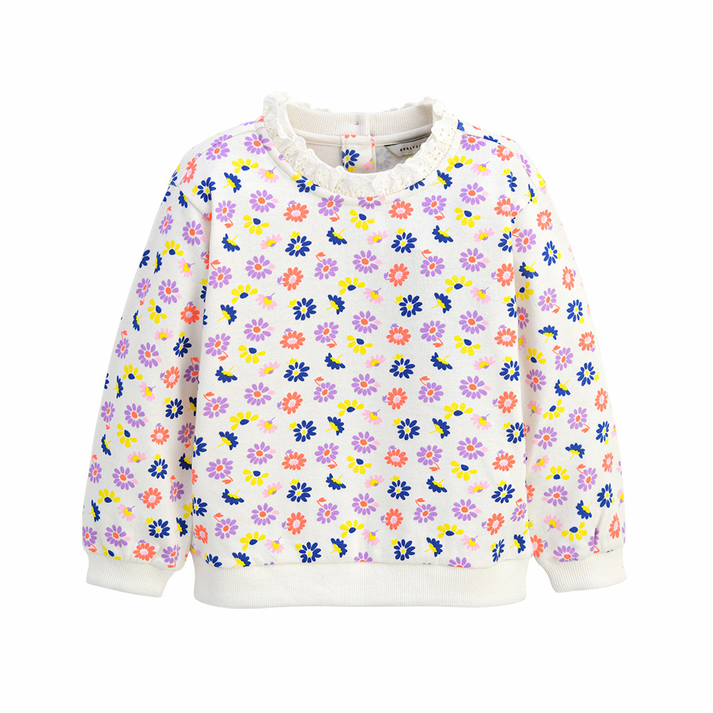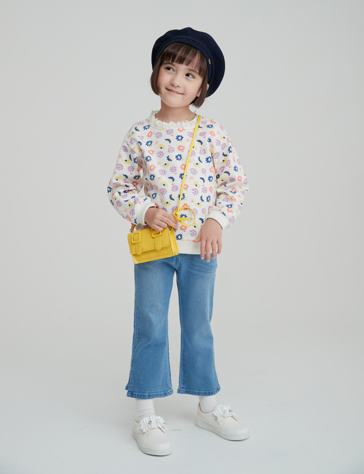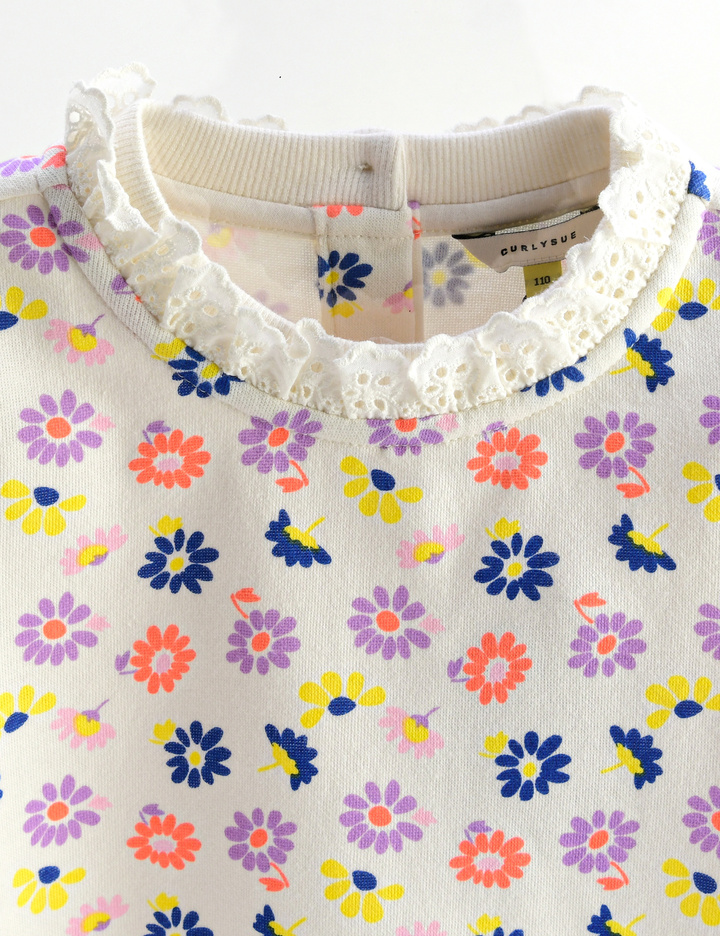 애리 프릴 레이스와 플라워 전판나염이 봄의 싱그러운 무드를 선사합니다. 데일리 등원 룩, 나들이 룩으로 데님 스커트, 데님 팬츠, 면 팬츠 등 코디가 용이한 맨투맨입니다.
