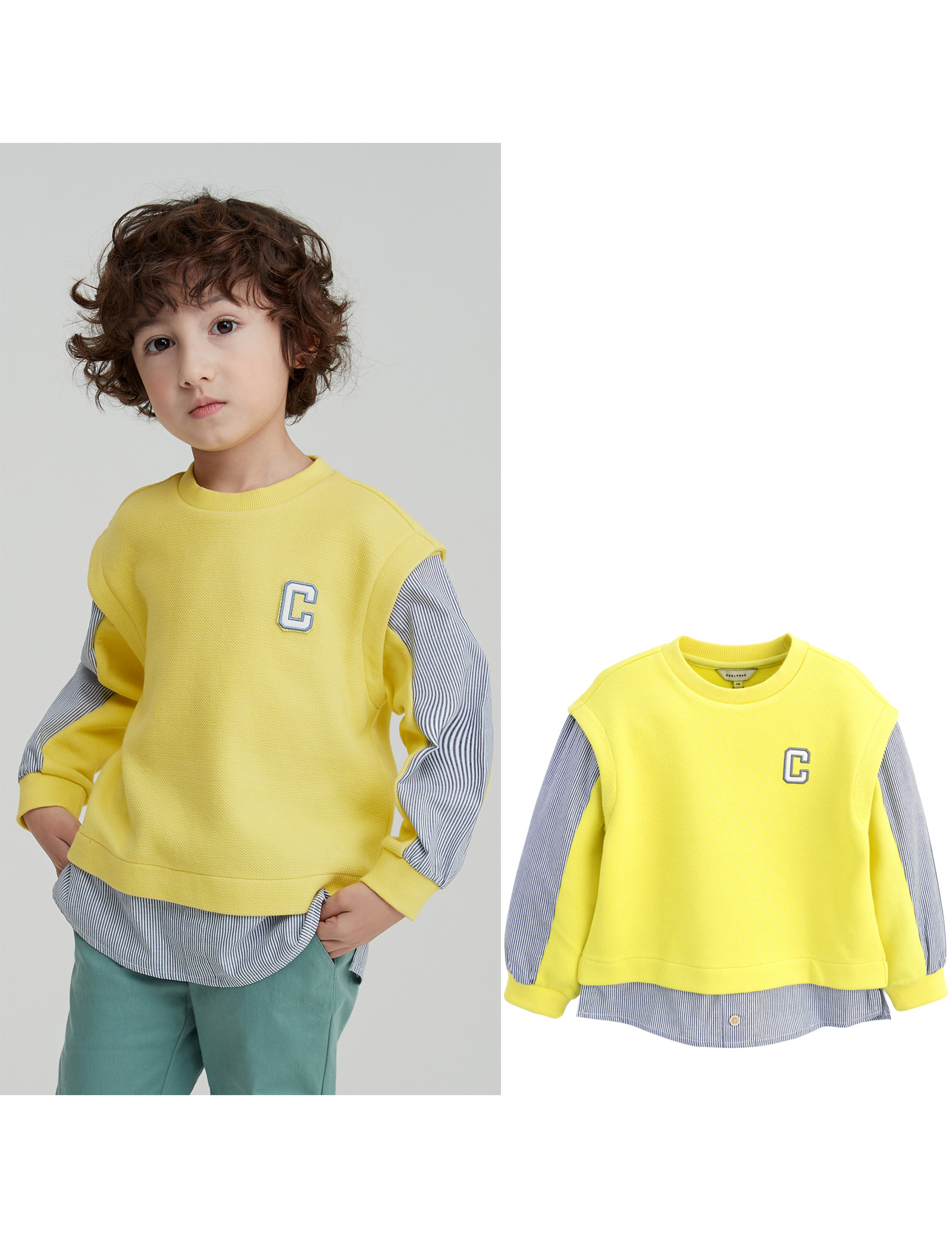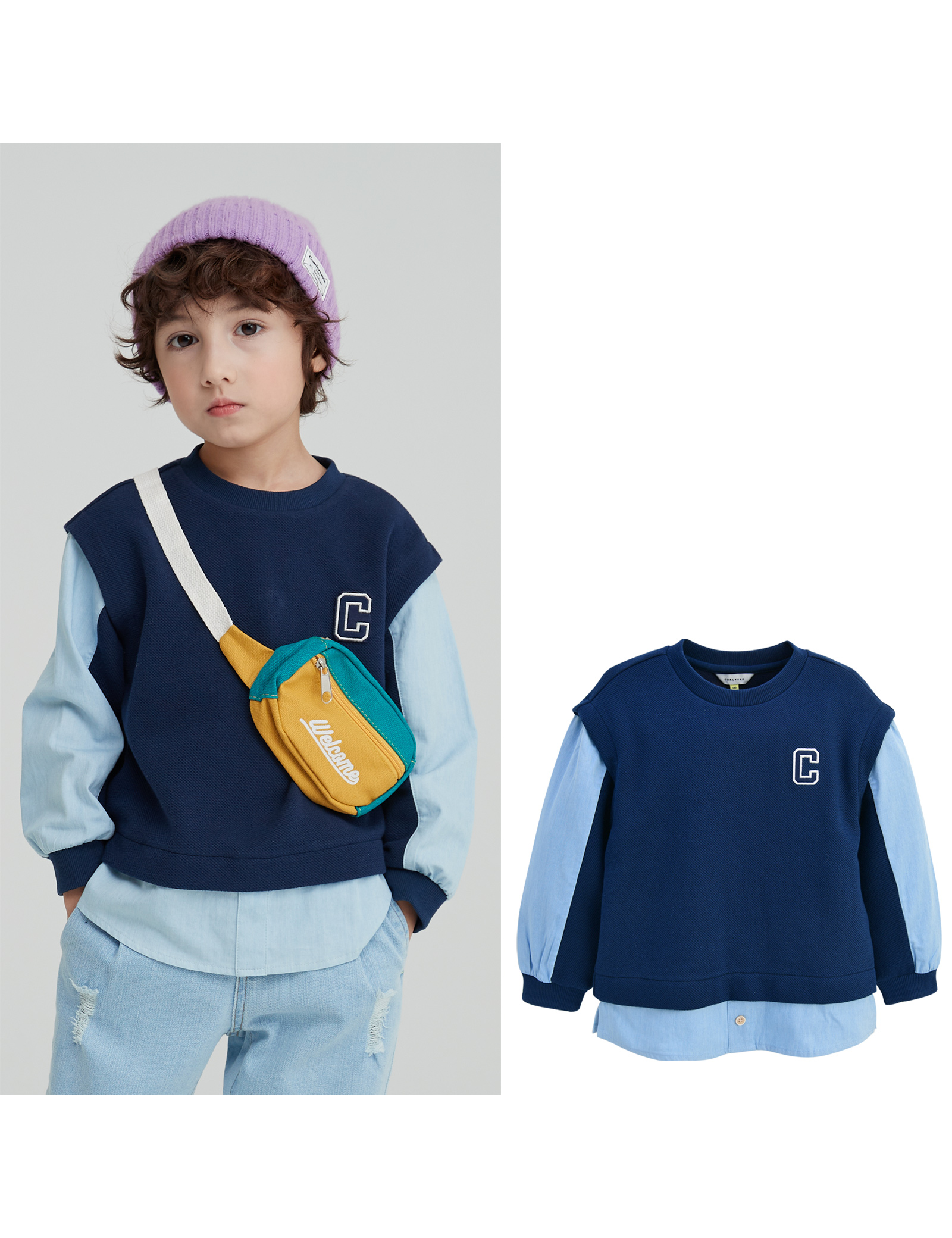 배색 원단으로 포인트를 주어 셔츠를 레이어드 한 느낌을 주는 맨투맨 티셔츠입니다. 가슴 부분에 와펜 장식이 고급스러운 느낌을 더해주는 상품입니다.