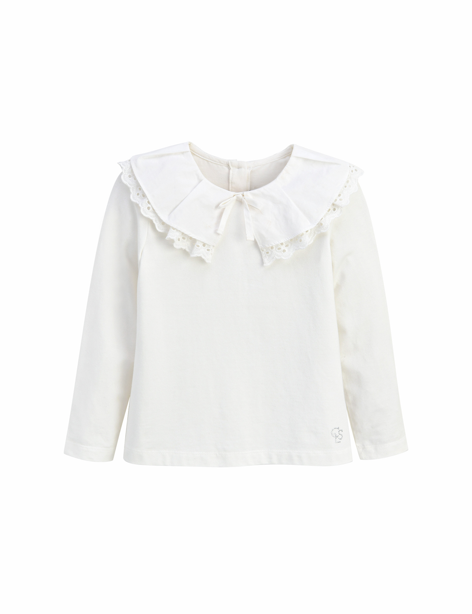 트렌디한 빅 카라 디자인의 티 블라우스입니다. 레이스가 매치된 두 겹 카라 디자인으로 여성스럽고, 가디건, 트렌치코트와 코디 시 카라를 겉으로 내어 코디하면 세련된 룩을 연출해 주는 아이템입니다.