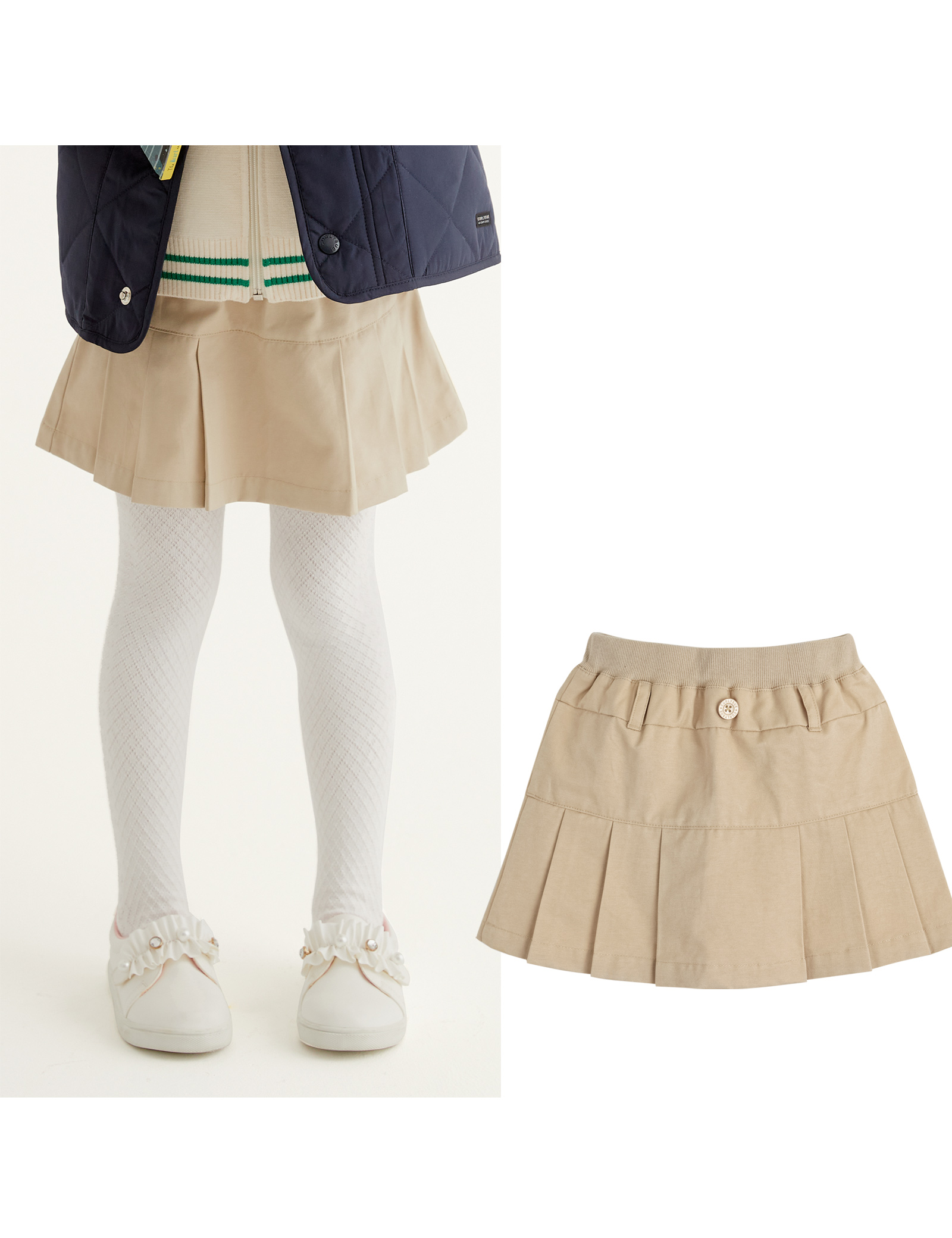 이번 시즌 유행인 플리츠 스커트입니다.캐쥬얼한 느낌을 주는 아이템 입니다.여아 넥 포인트 티셔츠나 맨투맨 등과코디가 용이한 아이템입니다.