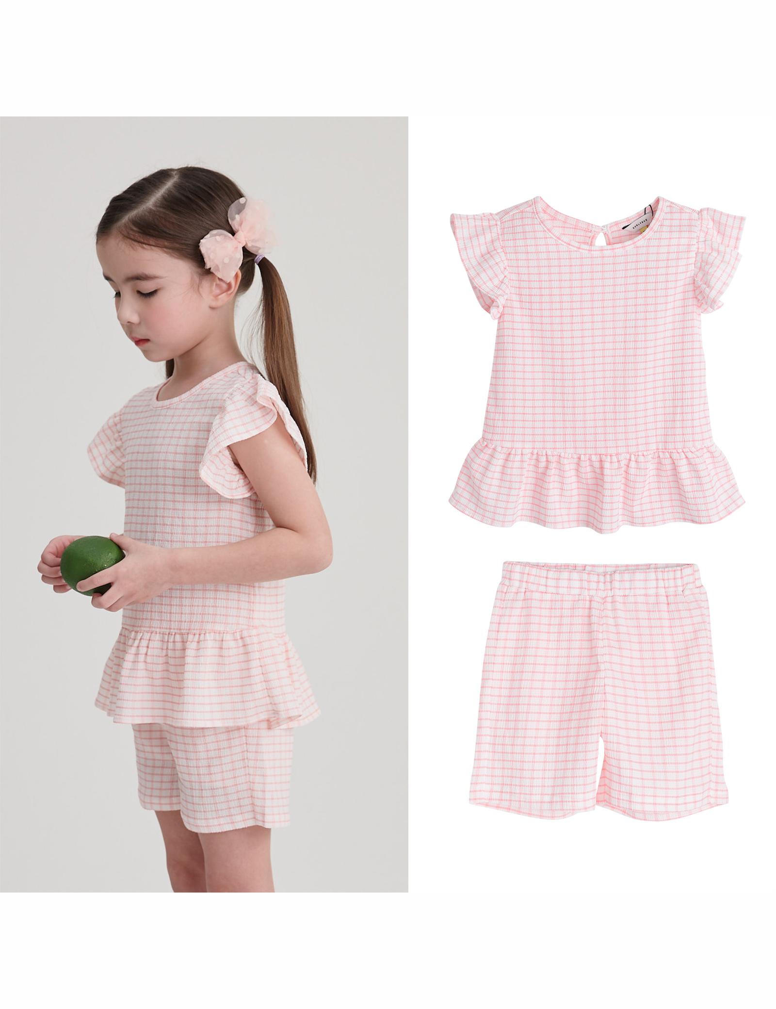 몸에 달라붙지 않는 시원한 터치감의 소재를 사용한 상하복입니다. 귀여운 하트나염지와 깨끗한 선염 체크 2가지 컬러모두 실내복부터 놀이터 외출까지 활용하기 좋은 아이템입니다.
