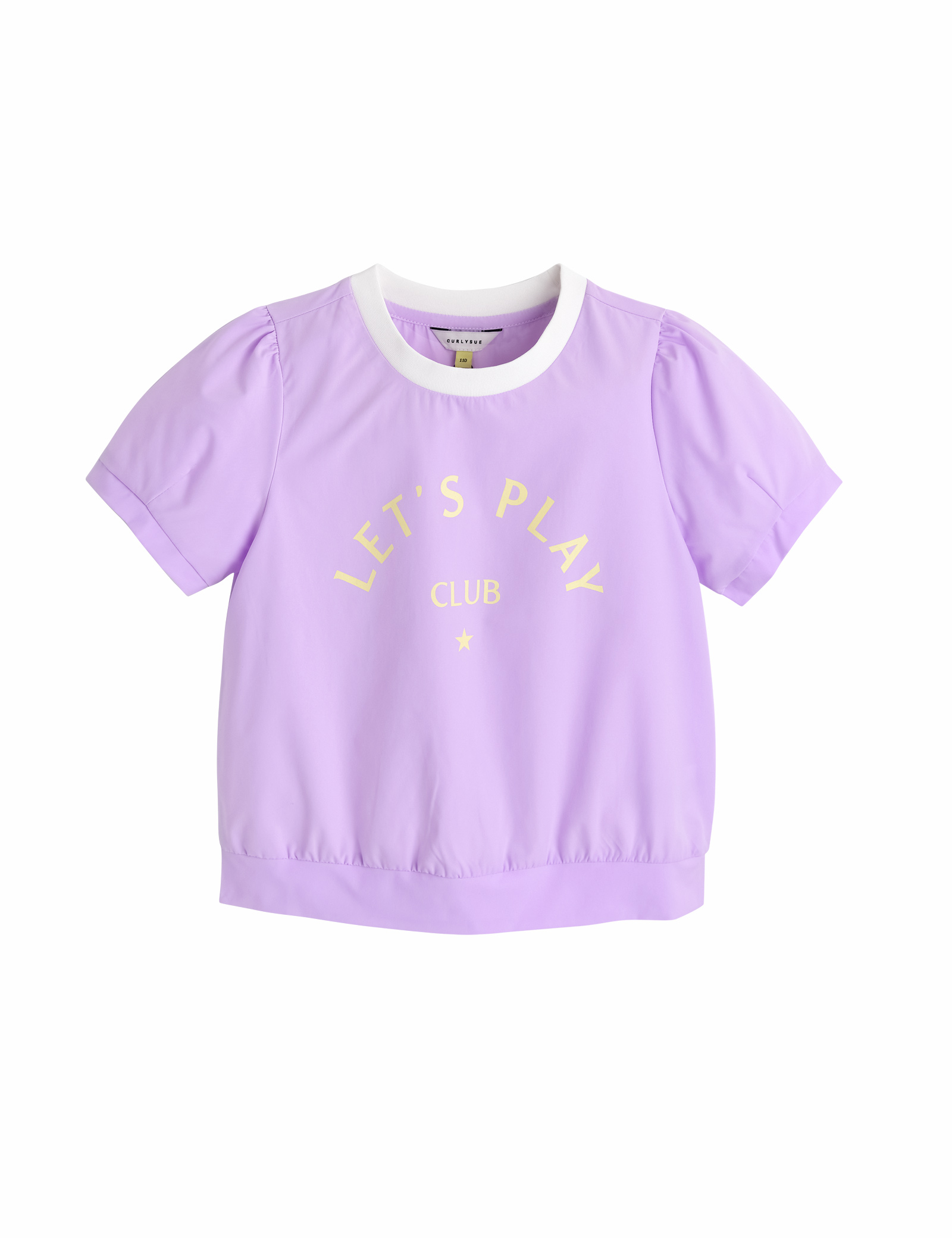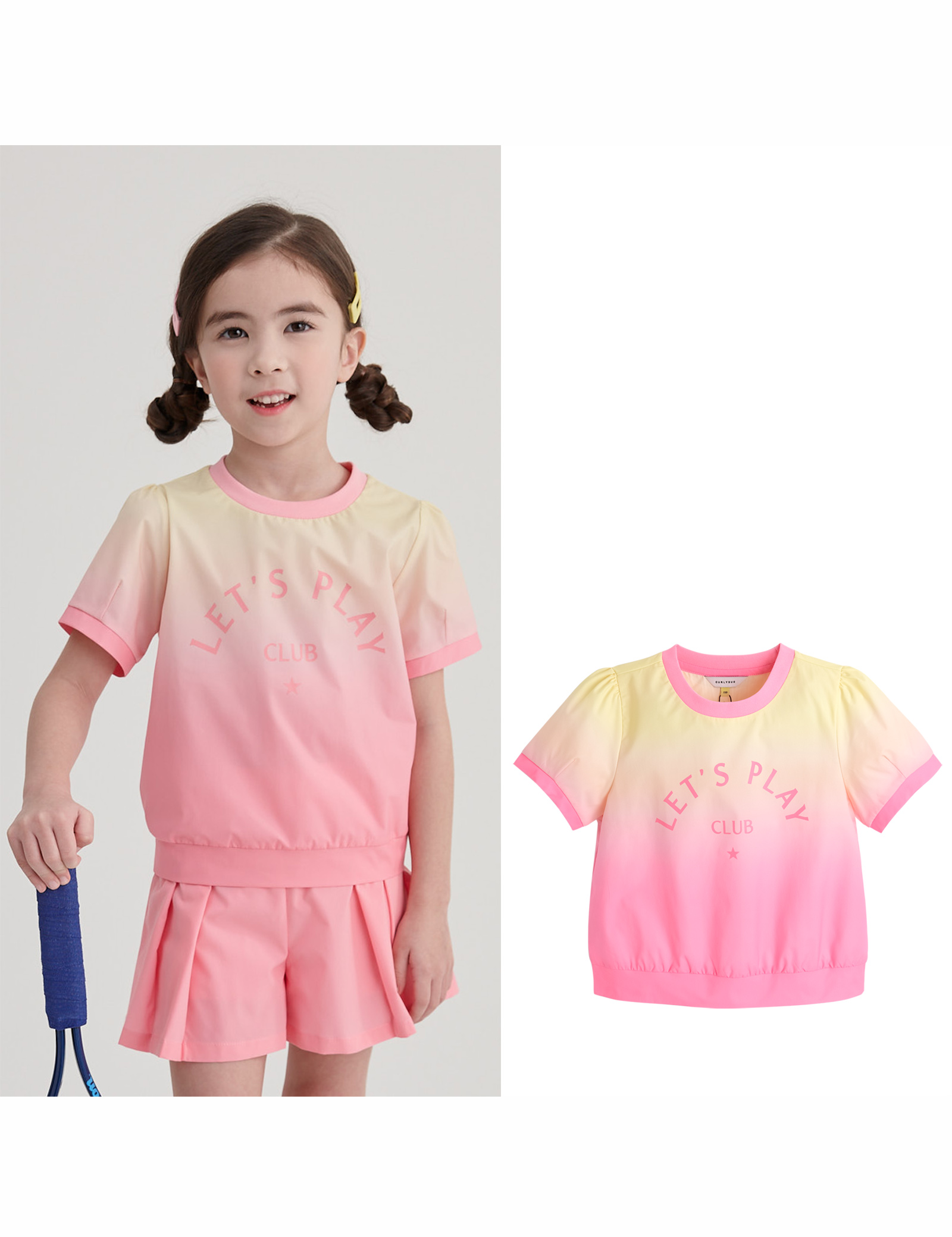 시원한 터치감에 여유있는 핏이 포인트인 티셔츠입니다. 볼륨감 있는 소매로러블리함을 더했으며 여아들이 좋아하는 바이올렛 컬러와 핑크 그라데이션 2가지 컬러로 진행되었습니다.