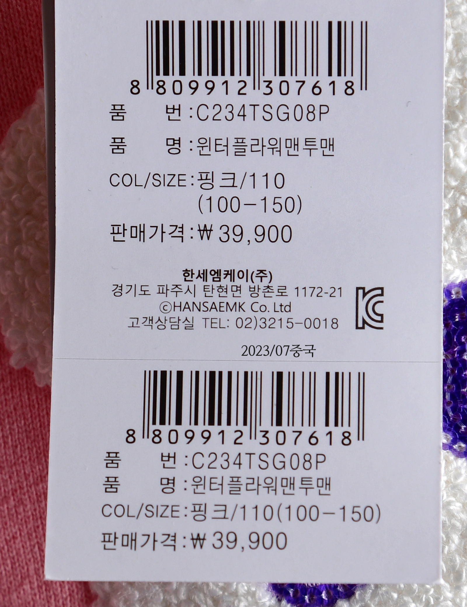 | 세탁방법 및 취급시 주의사항 | 본 세품은 손세탁 하십시오(케어라벨 참고) |