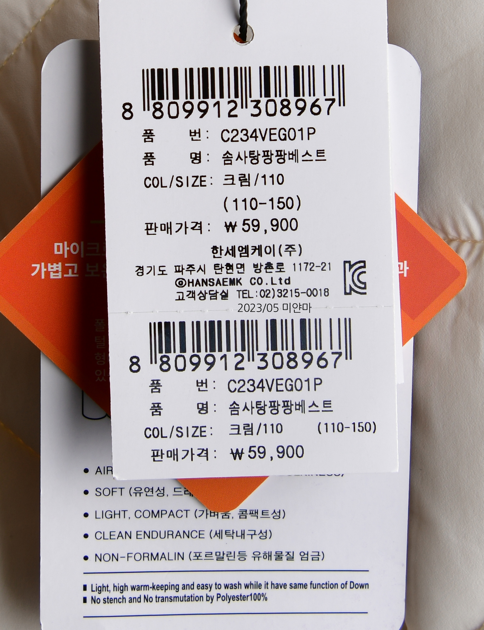 | 세탁방법 및 취급시 주의사항 | 본 세품은 손세탁 하십시오(케어라벨 참고) |