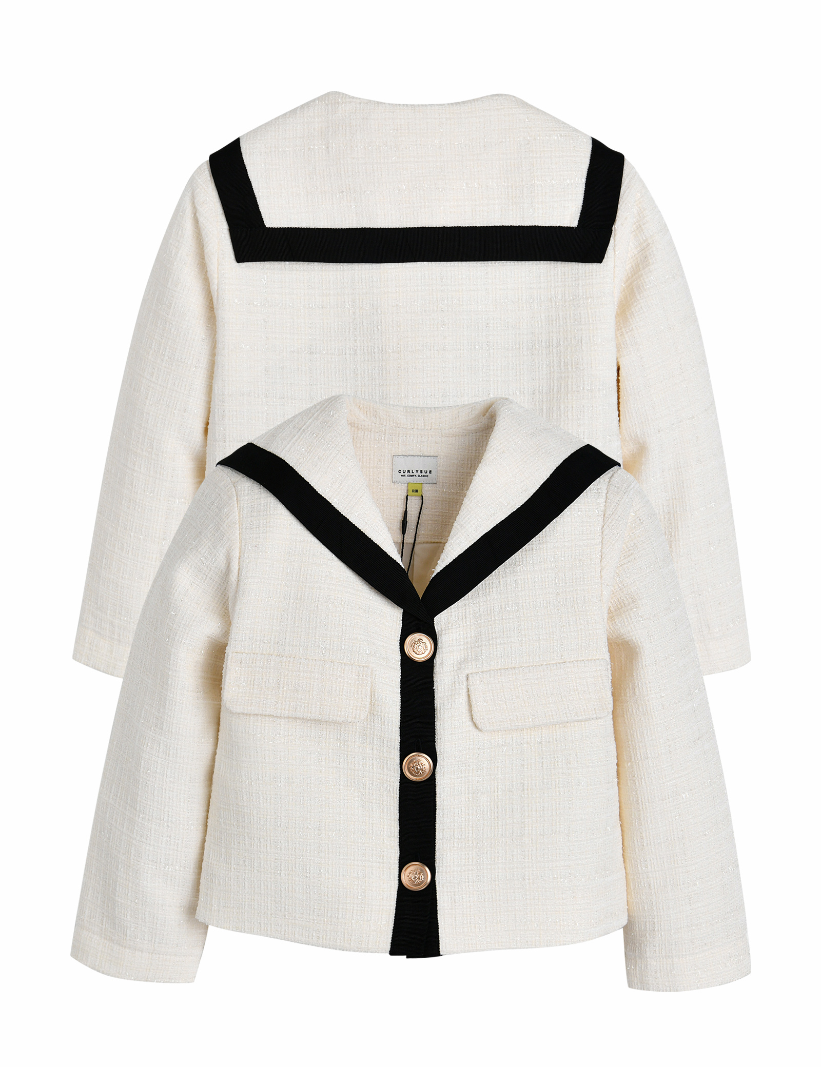 신학기 착장에 잘 어울리는 자켓입니다.배색 리본 테이프를 사용해서 고급진 느낌을 줬습니다. 세일러 카라 재킷으로귀여우면서도 클래식한 코디가 가능한자켓입니다.