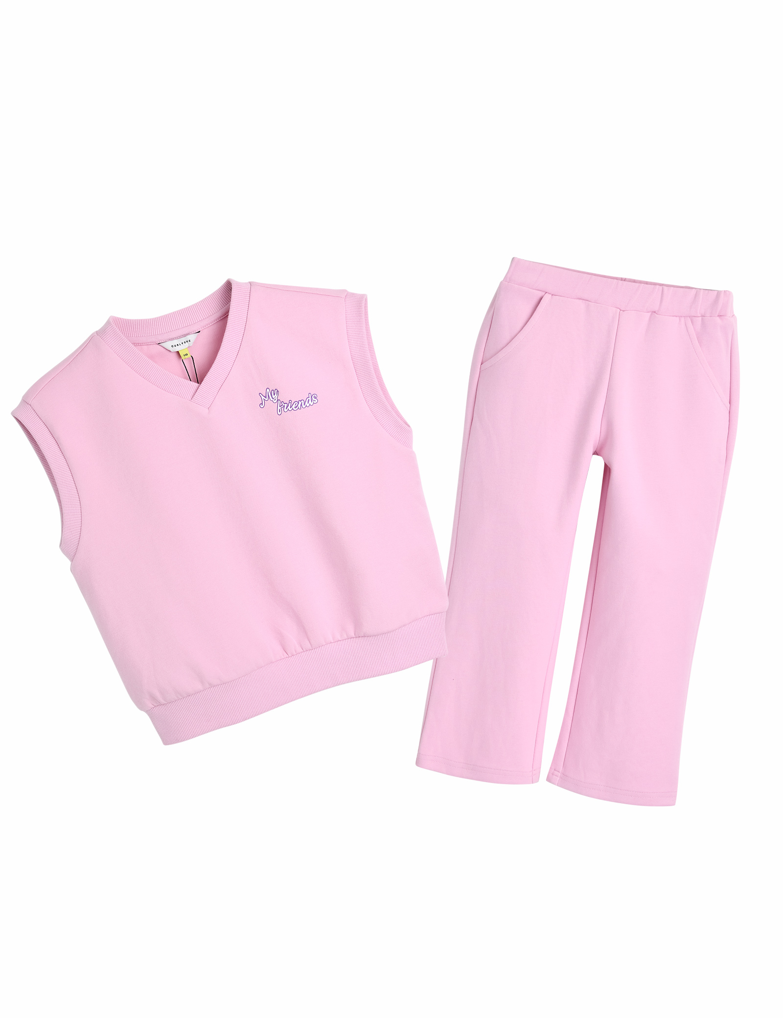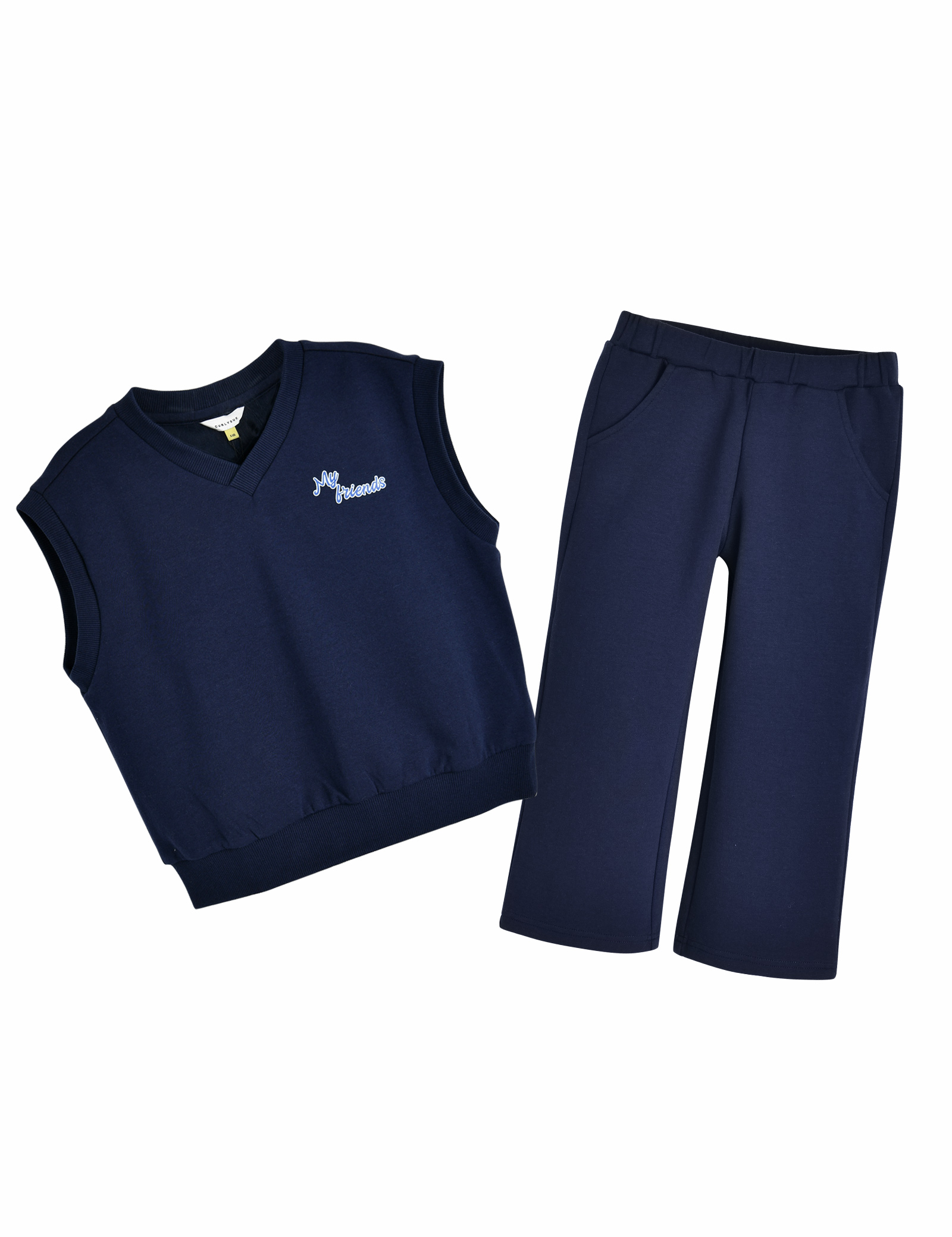 활동하기 좋은 폴리 쿠션지 소재의 상하세트입니다. 베스트와 세미 와이드 팬츠구성이 트렌디함과 활용도 모두 만족하는 만능 아이템입니다. 가슴에 레터링나염으로 포인트를 주었습니다.