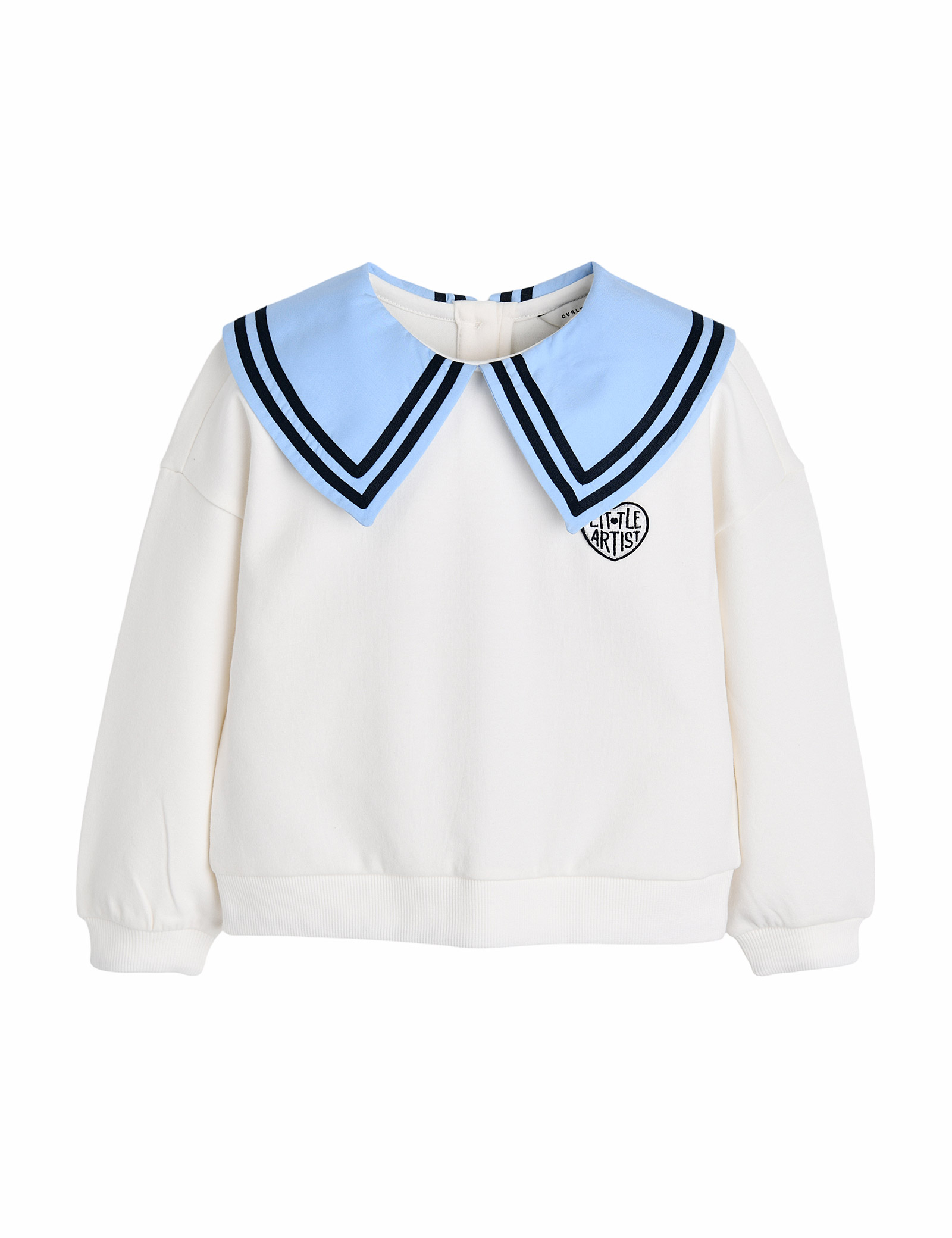 우븐 빅 카라가 포인트인 여아 맨투맨입니다. 루즈한 실루엣으로 편한 캐주얼착장이 가능하고 왼가에 자수 와펜으로심플한 포인트를 주었습니다. 주름 스커트, 데님 팬츠 등 캐주얼한 코디에 어울립니다.