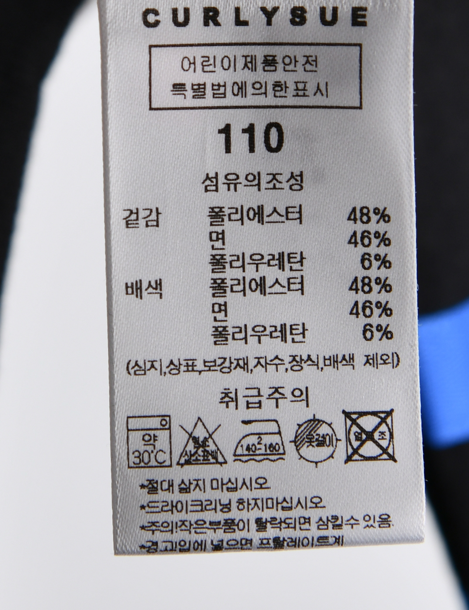 제품소재 (겉감/배색)폴리에스터48%,면46%,폴리우레탄6%