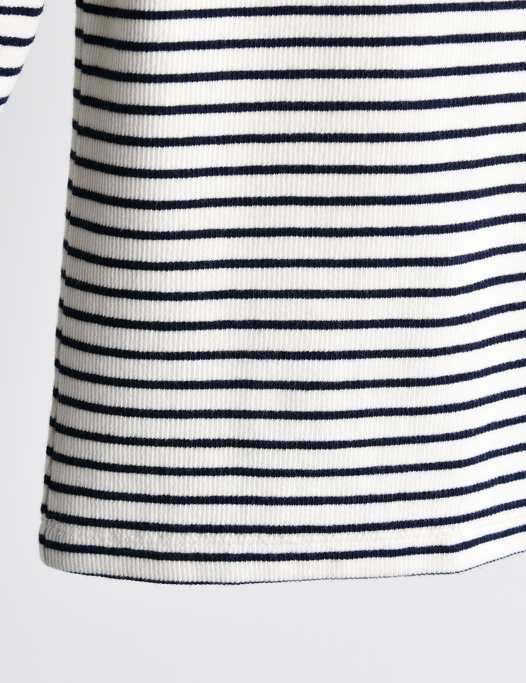 스타일리시하게 입을 수 있는 스트라이프 골지 티셔츠입니다. 베이직한 핏으로단독 또는 레이어드 착용에 용이한 아이템입니다. 다양한 아이템에 코디하여 착용해주세요.