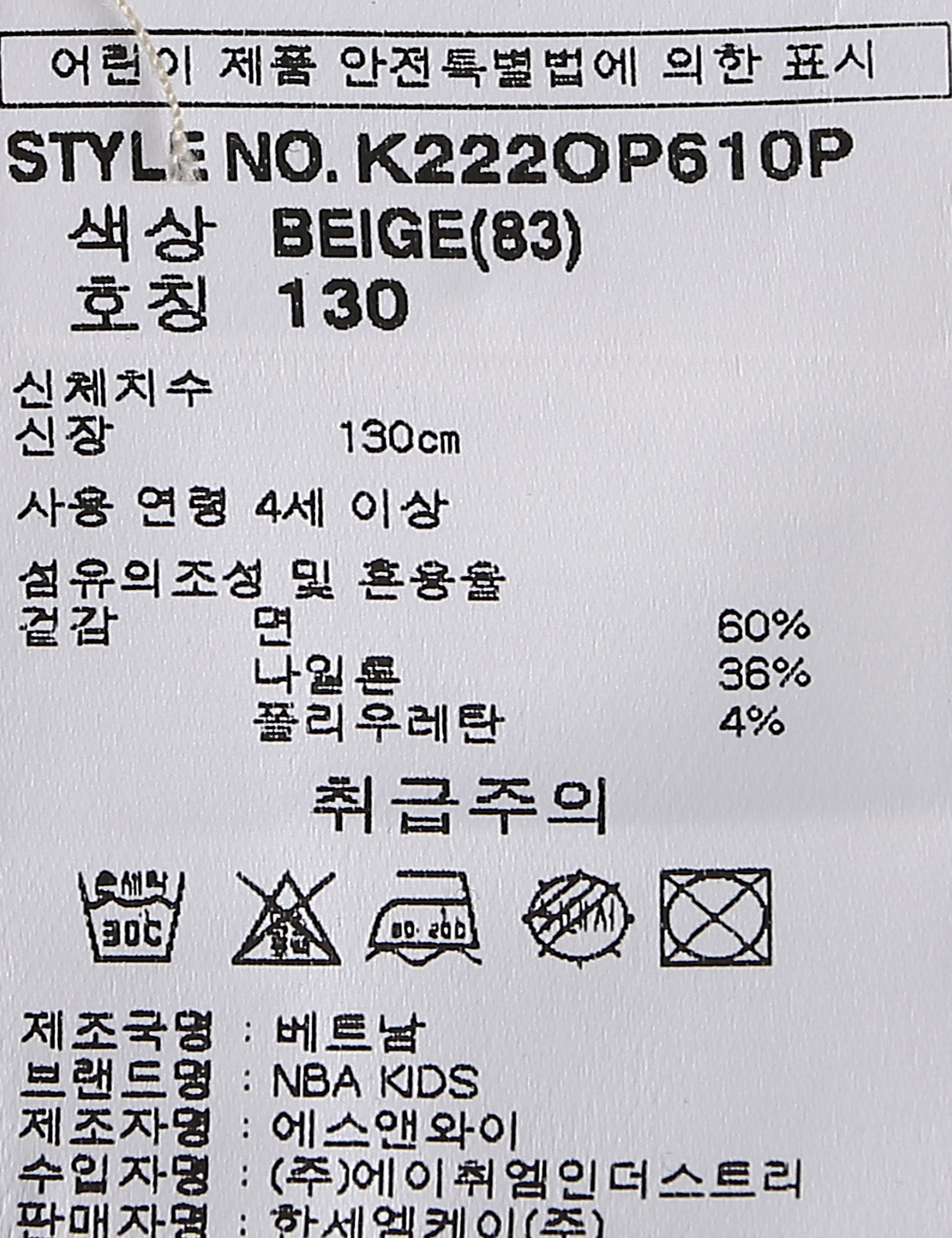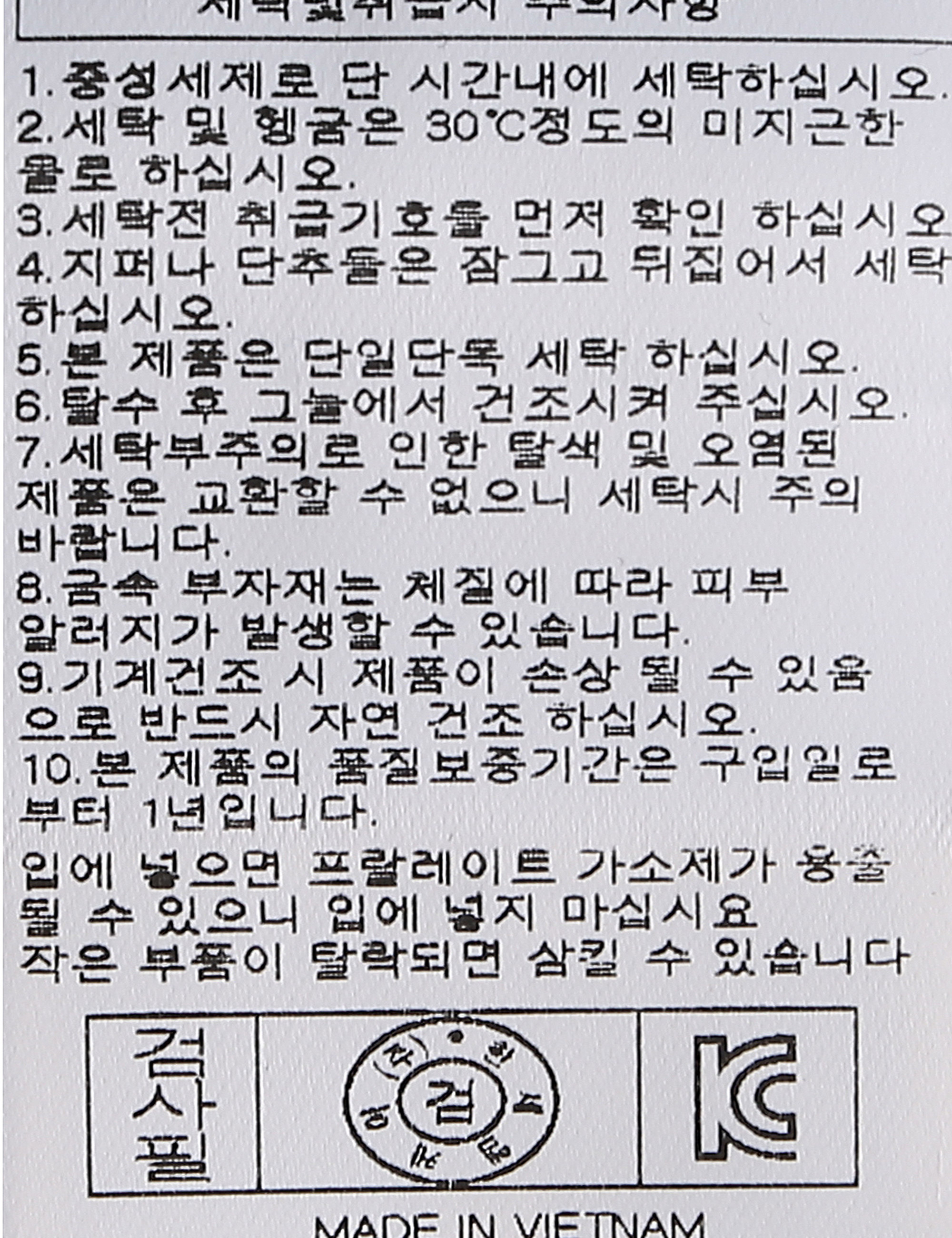 | 세탁방법 및 취급시 주의사항 | 본 제품은 손세탁 하십시오.(케어라벨참고) |