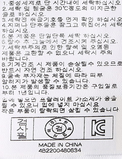 | 세탁방법 및 취급시 주의사항 | 중성세제로 단 시간내에 세탁하십시오.(케어라벨참고) |