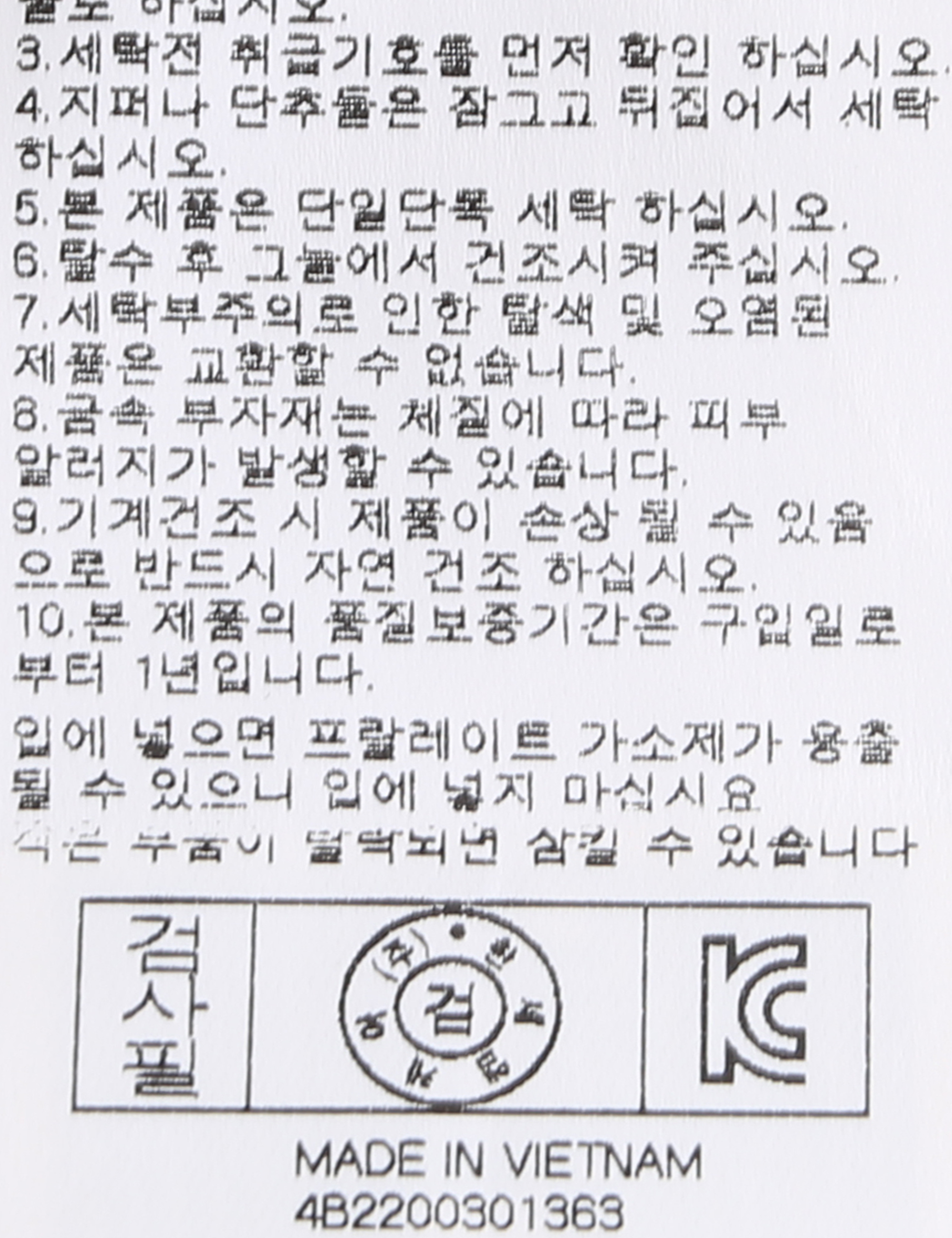 | 세탁방법 및 취급시 주의사항 | 본 제품은 손세탁 하십시오.(케어라벨참고) |