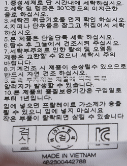 | 세탁방법 및 취급시 주의사항 | 본 제품은 손세탁 하십시오.(케어라벨참고) |