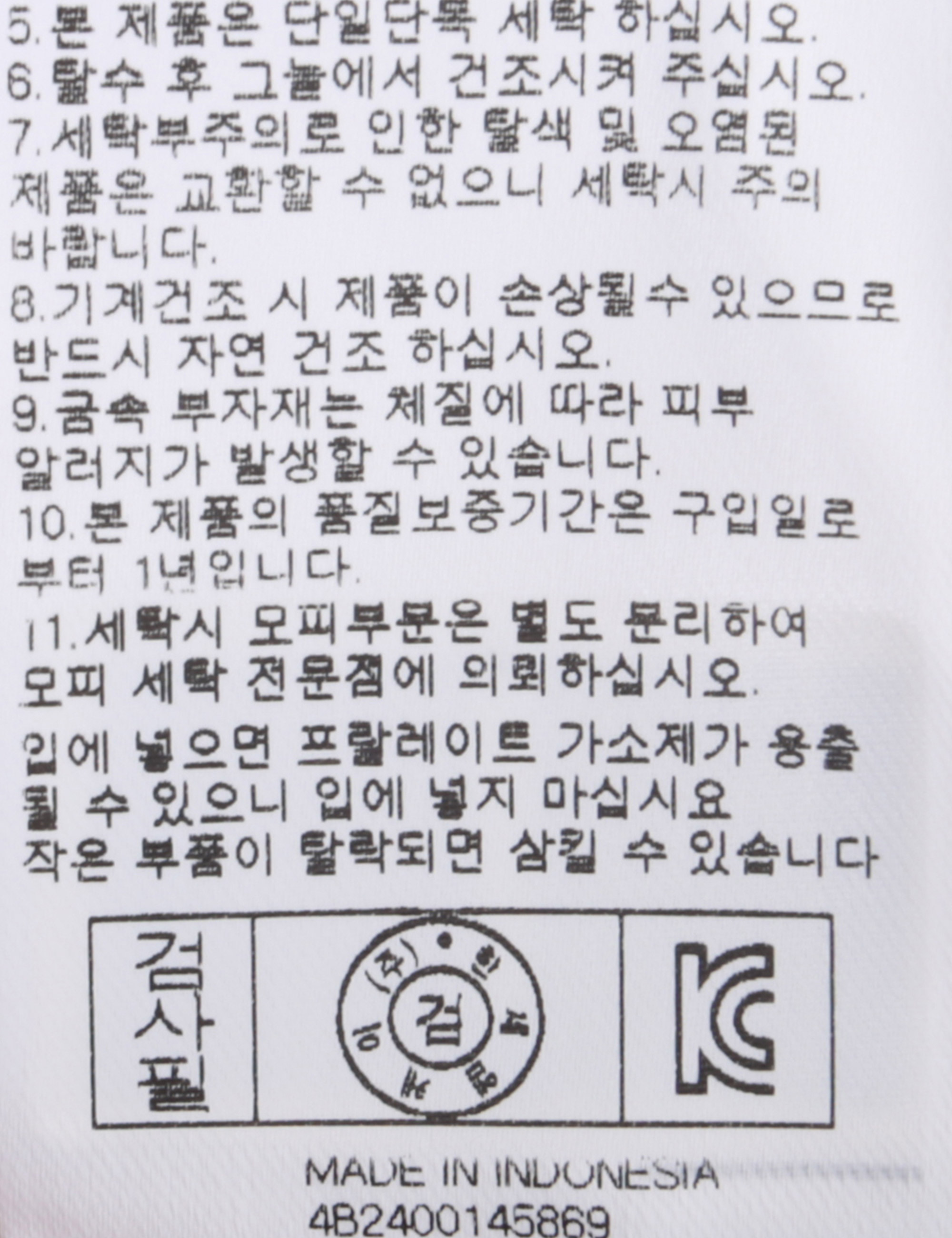 | 세탁방법 및 취급시 주의사항 | 중성세제로 단 시간내에 세탁하십시오.(케어라벨참고) |