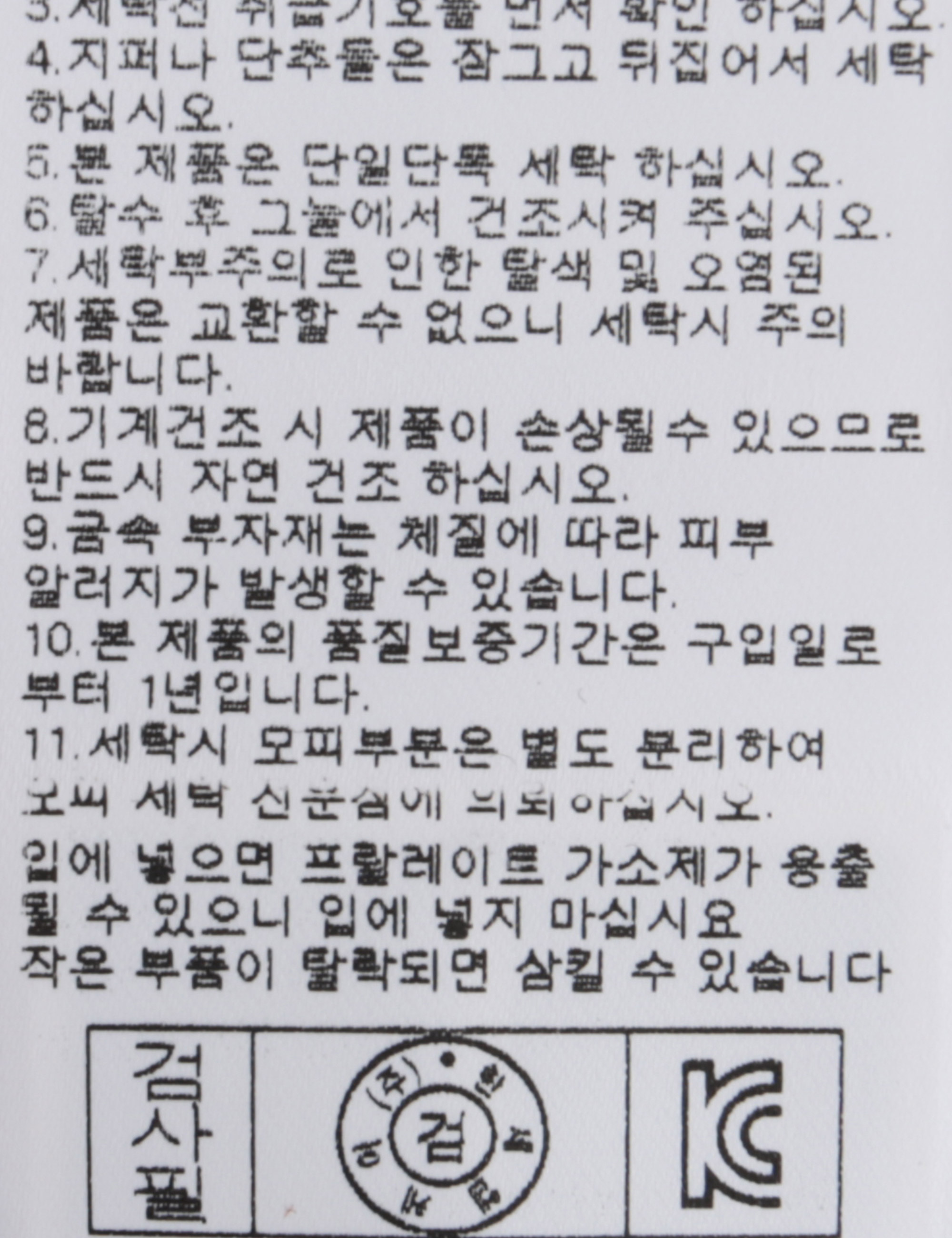 | 세탁방법 및 취급시 주의사항 | 중성세제로 단 시간내에 세탁하십시오.(케어라벨참고) |