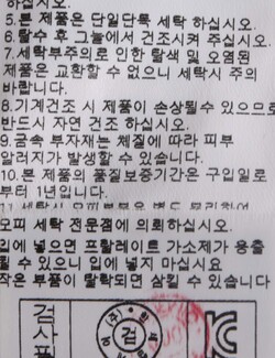 | 세탁방법 및 취급시 주의사항 | 중성세제로 단 시간내에 세탁하십시오.(케어라벨참고) |
