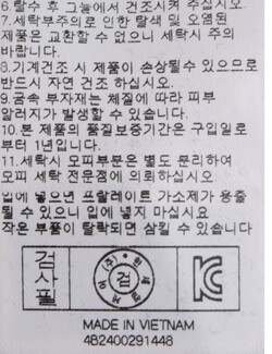 | 세탁방법 및 취급시 주의사항 | 중성세제로 단 시간내에 세탁하십시오.(케어라벨참고) |