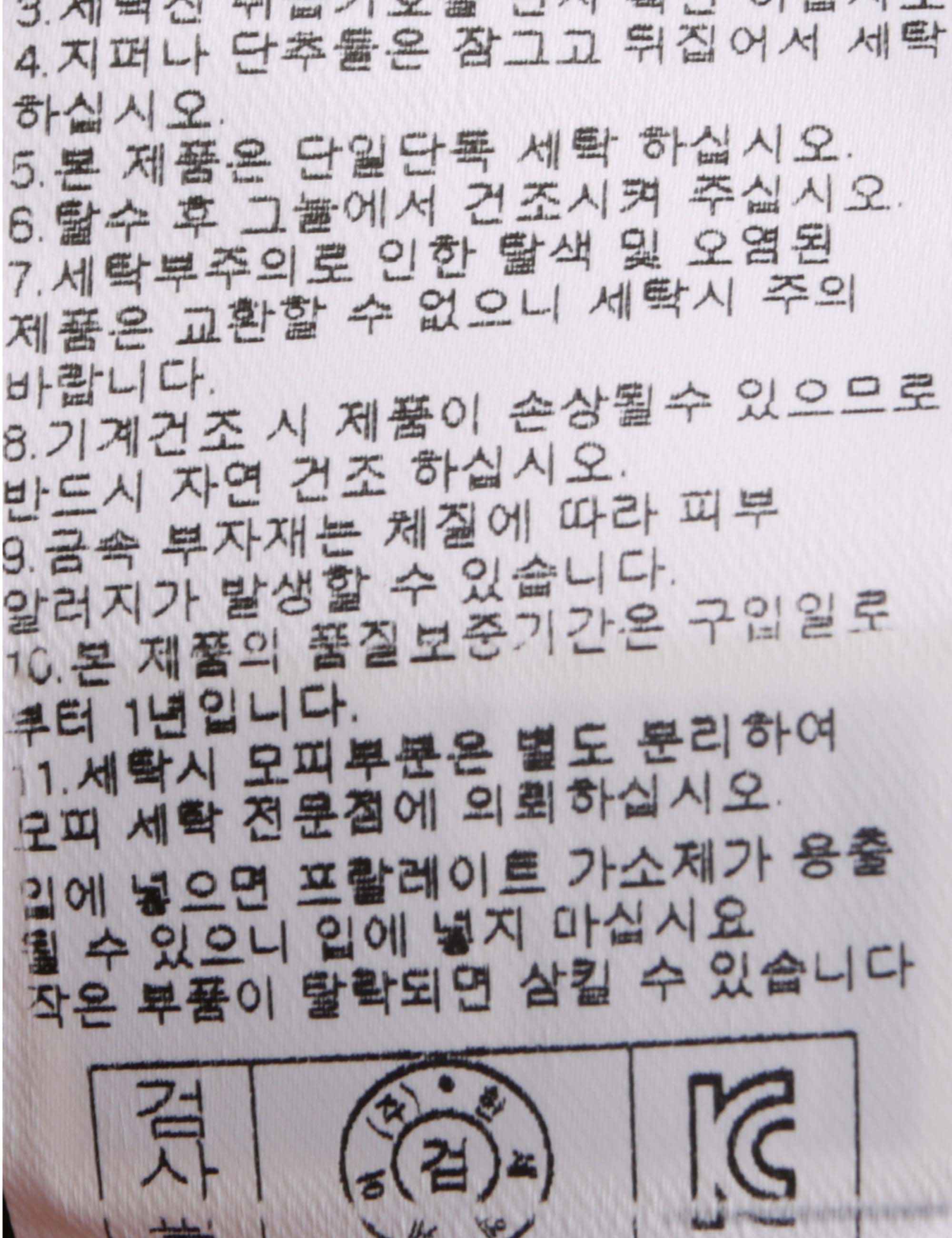 | 세탁방법 및 취급시 주의사항 | 본 제품은 손세탁 하십시오.(케어라벨참고) |
