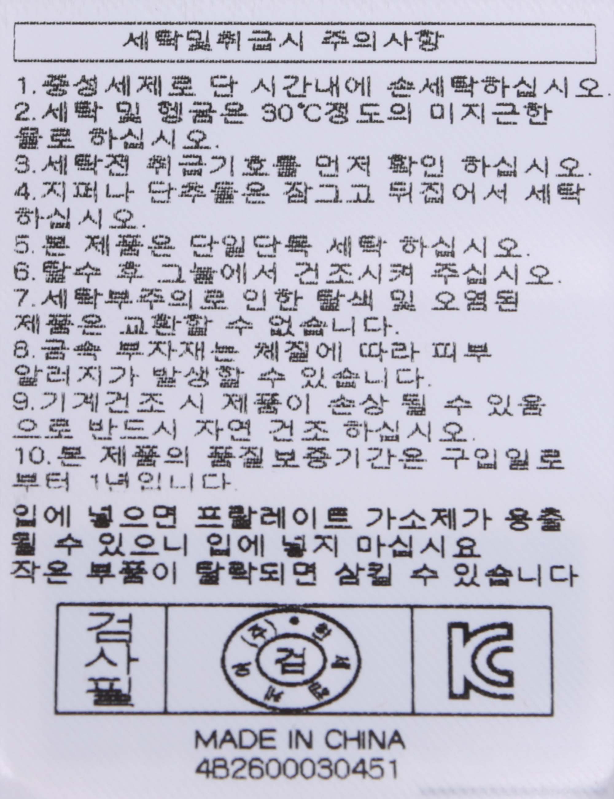 | 세탁방법 및 취급시 주의사항 | 본 제품은 손세탁 하십시오.(케어라벨참고) |