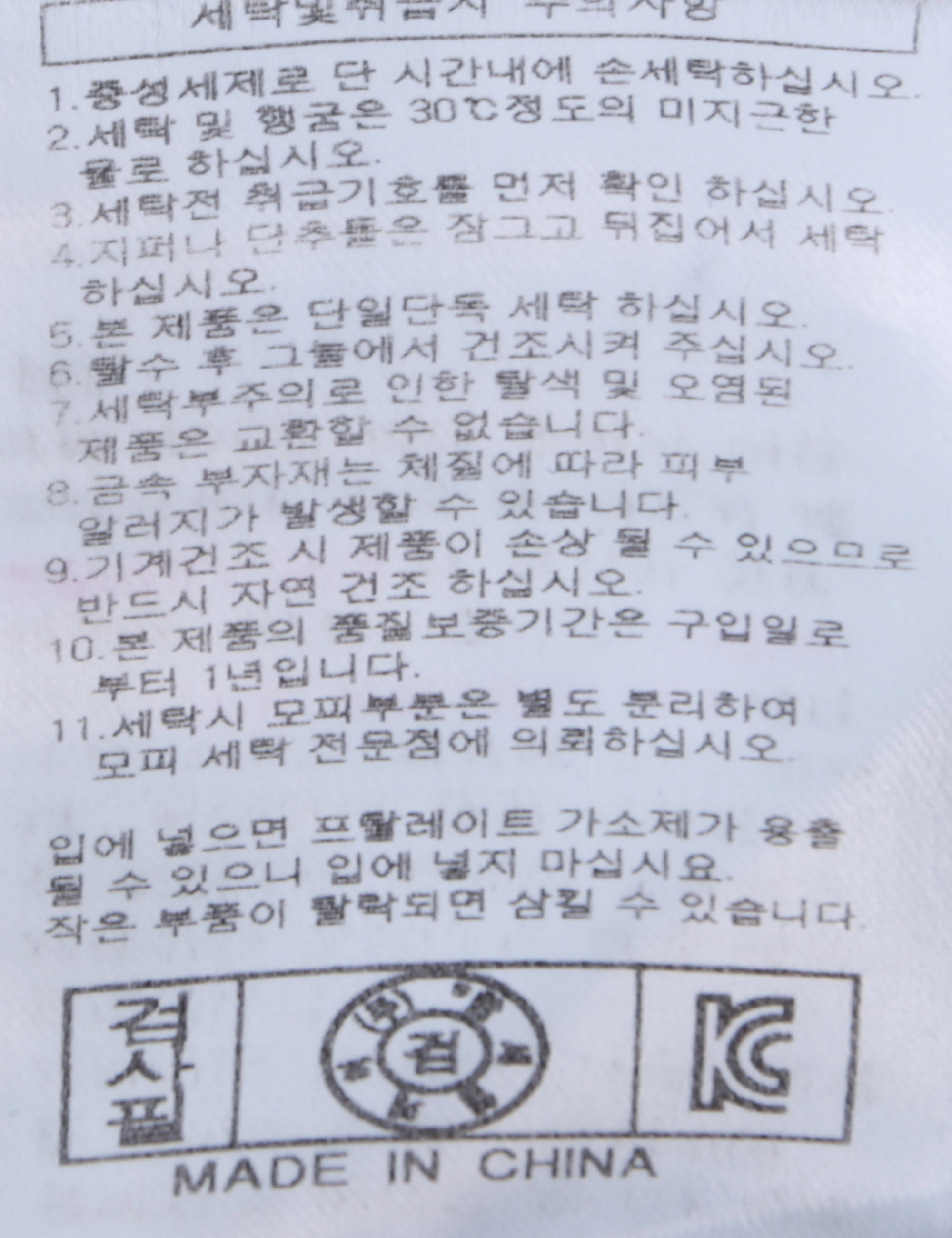 | 세탁방법 및 취급시 주의사항 | 본 제품은 손세탁 하십시오.(케어라벨참고) |