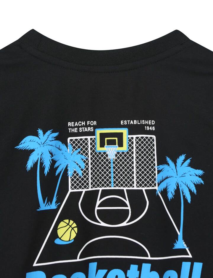 시원한 터치감의 폴리 PK 원단에 야자나무와 농구장 그래픽, 비비드한 컬러 포인트를 더해 여름철 쾌적하게 착용 가능한 루즈핏 티셔츠