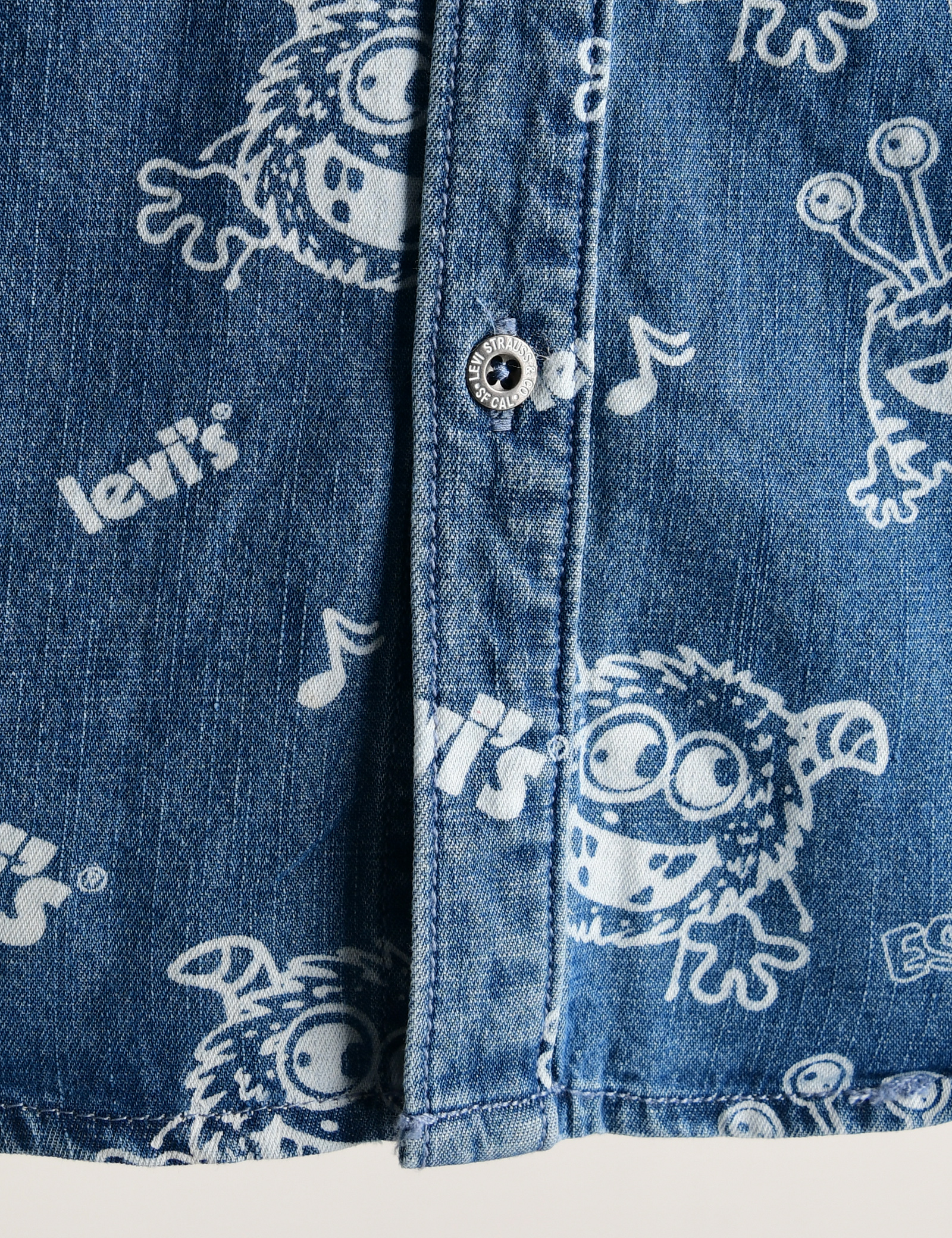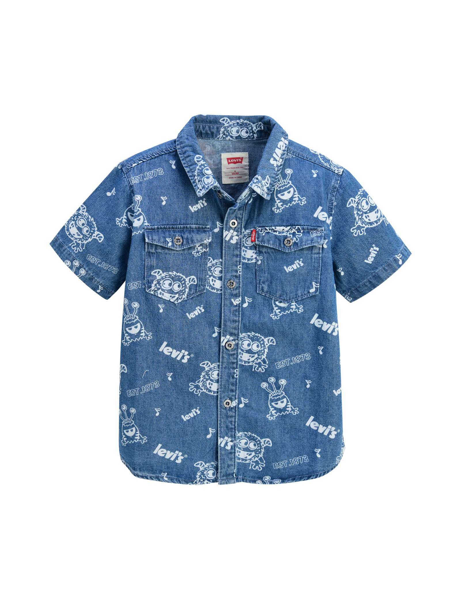 리틀몬스터 캐릭터가 올오버로 프린트된 가벼운 데님 소재의 반팔셔츠