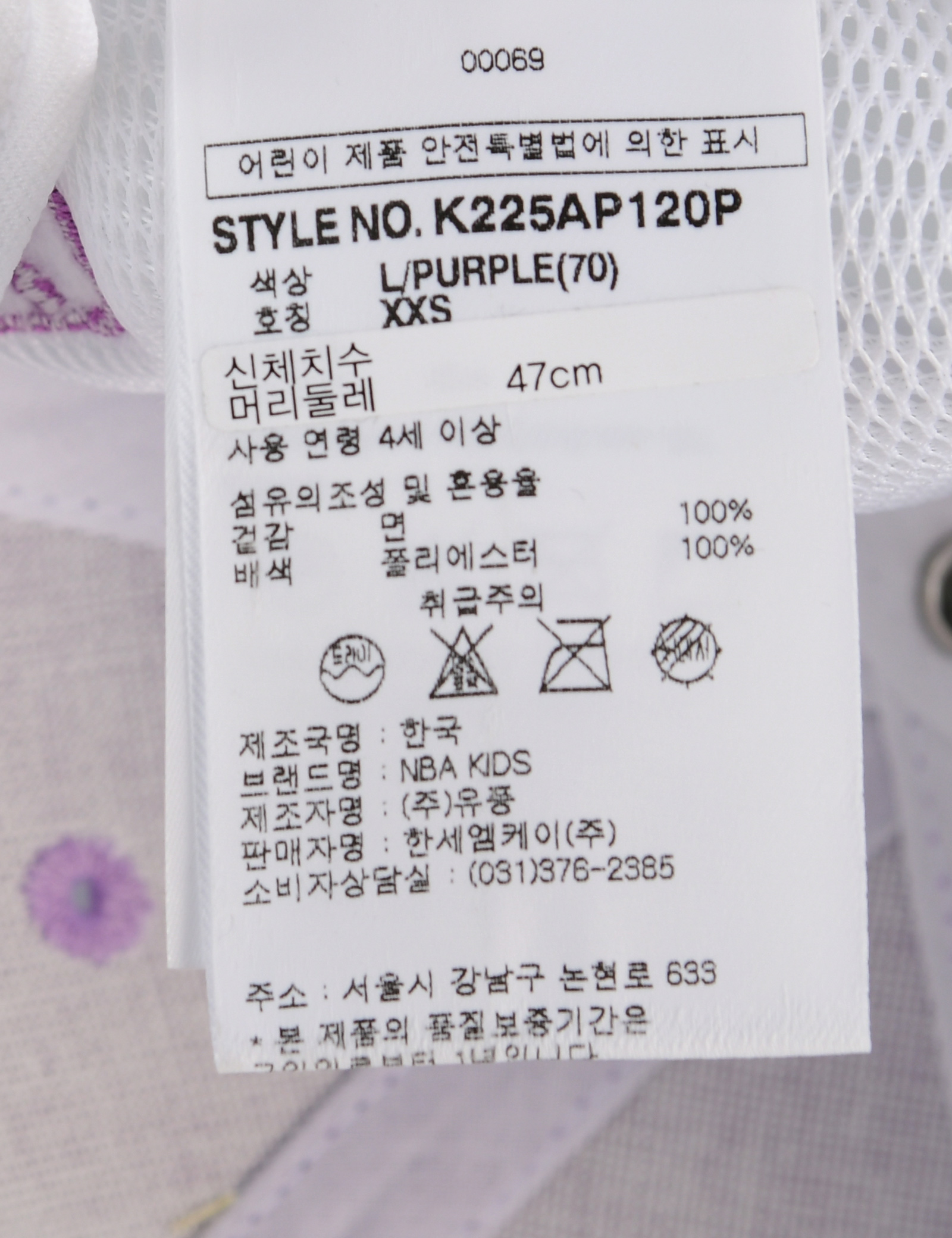 제품소재 (겉감)면100%(배색)폴리에스터100%