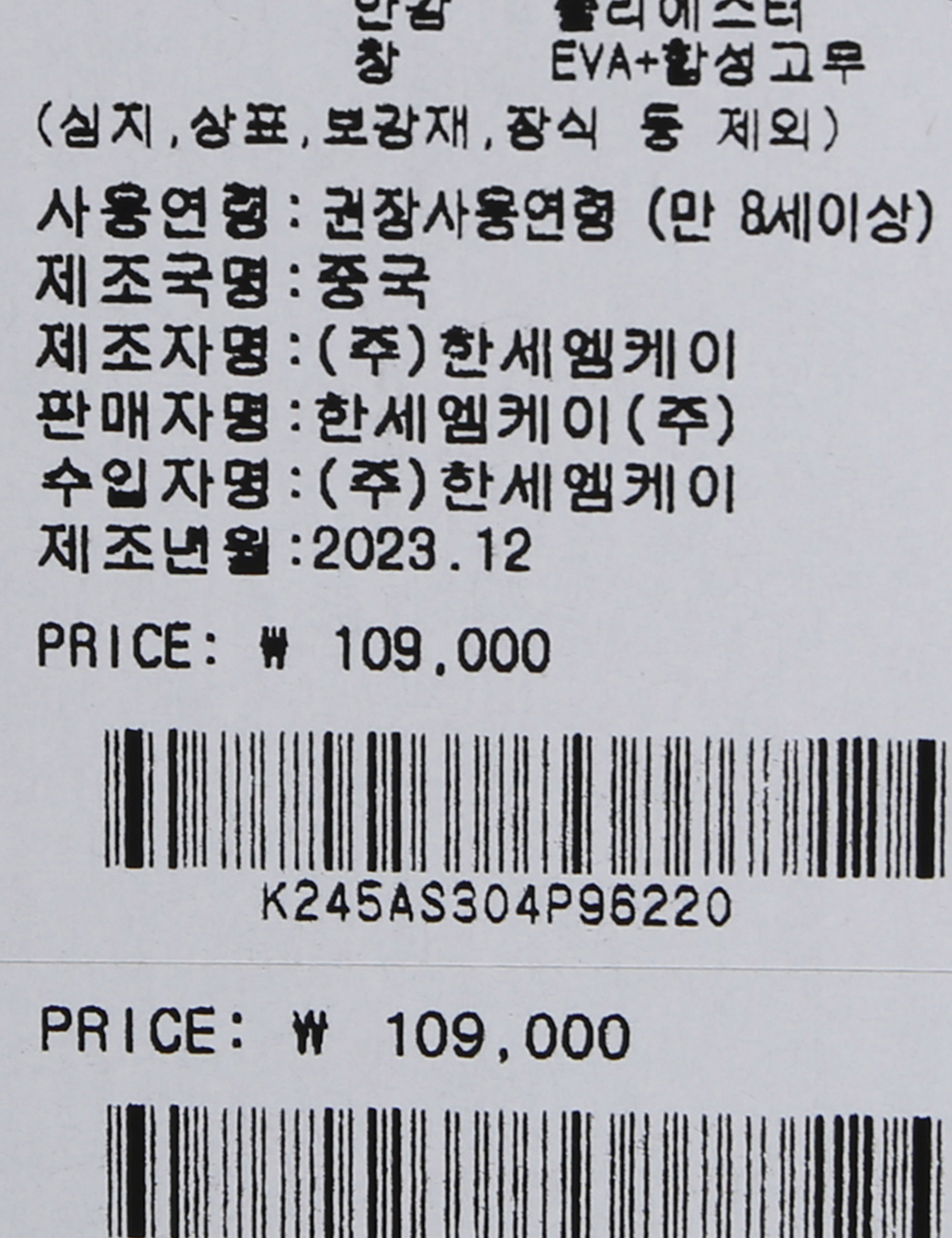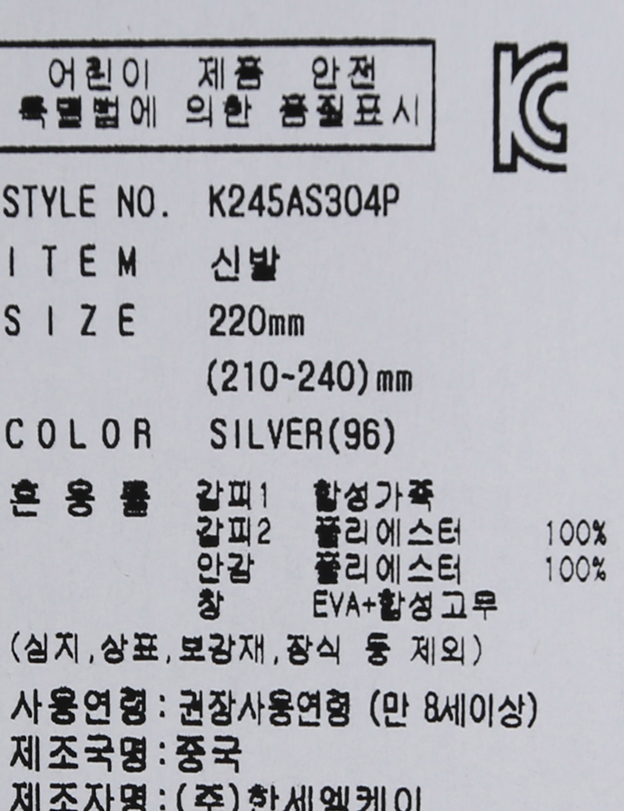 제품소재 [갑피1]합성가죽 [갑피2]폴리에스터100% [안감]폴리에스터100% [창]EVA+합성고무