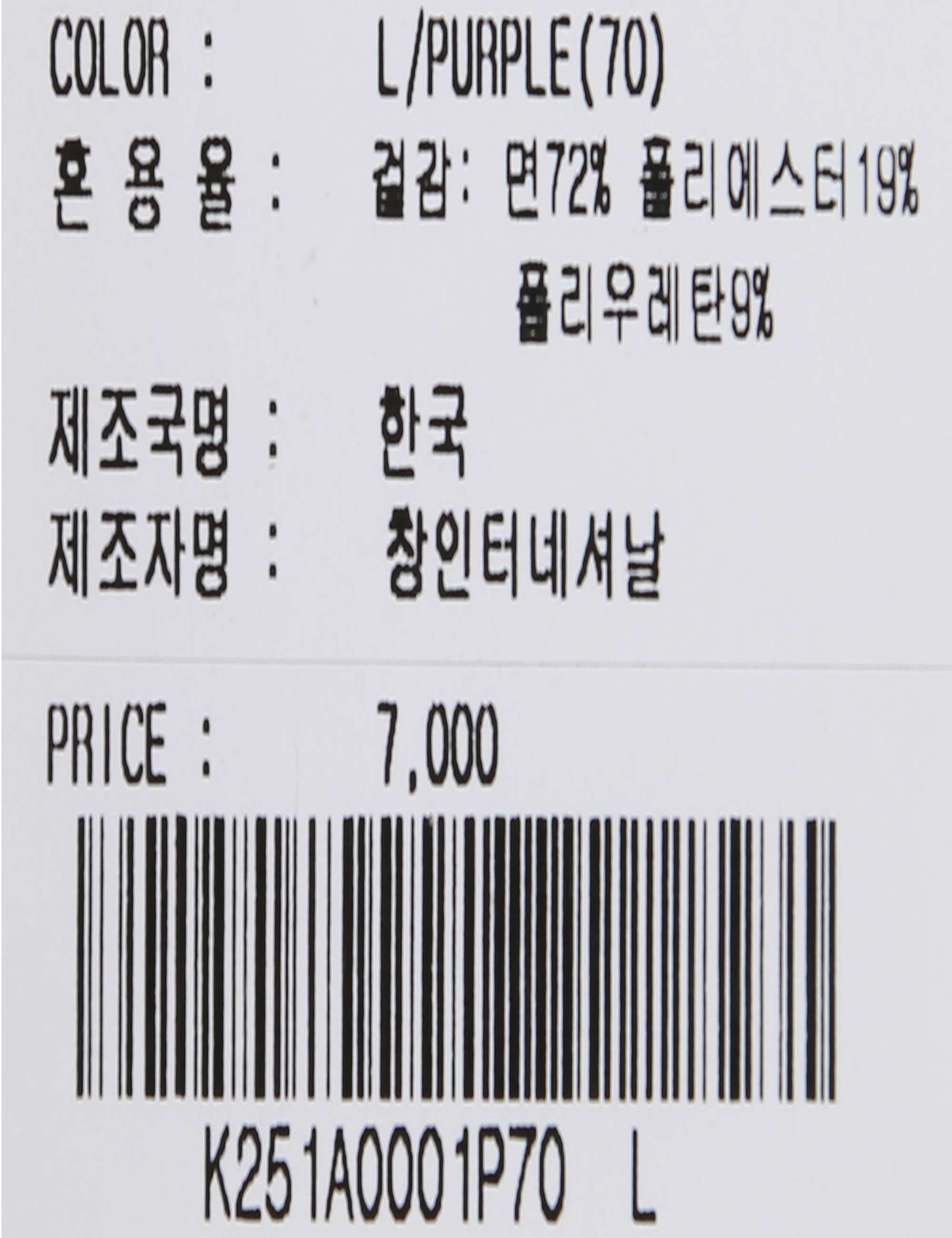 제품소재 [겉감]면72% 폴리에스터19% 폴리우레탄9%