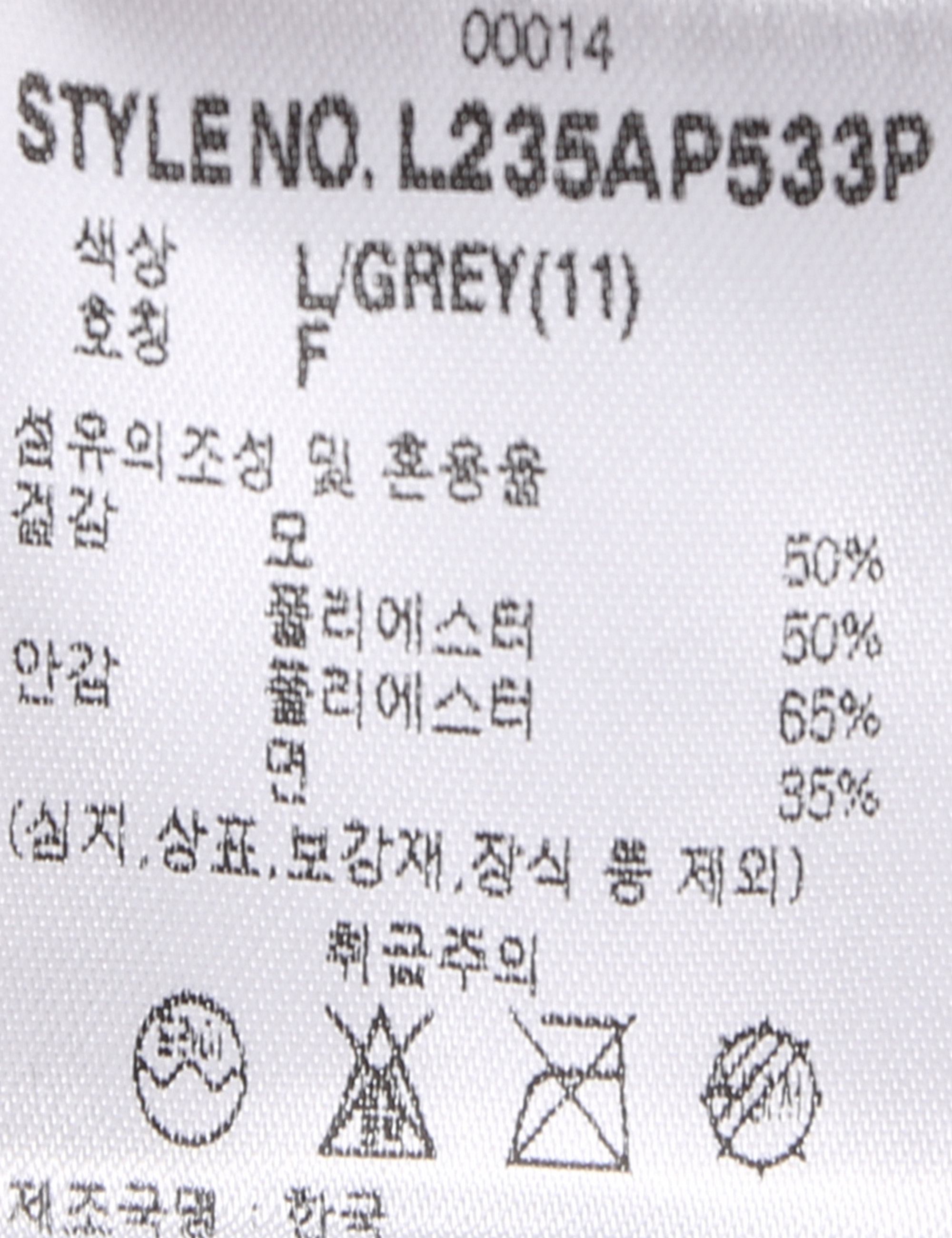 브랜드 홈 바로가기| 제품소재 | [겉감]모65% 레이온20% 폴리에스터15% [안감]폴리에스터65% 면35% |