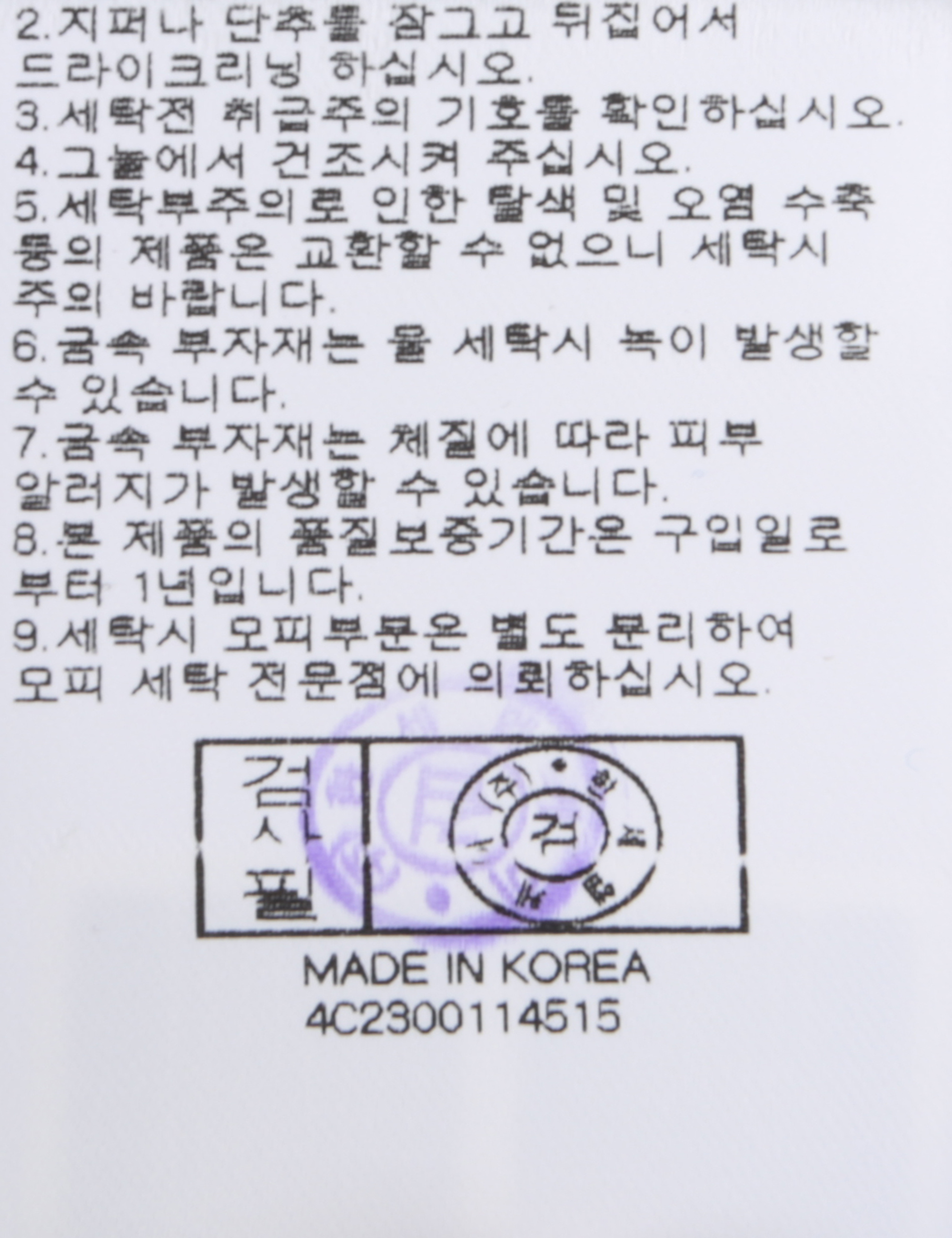 | 세탁방법 및 취급시 주의사항 | 본 제품은 반드시 드라이크리닝 하십시오.(세탁라벨참고) |