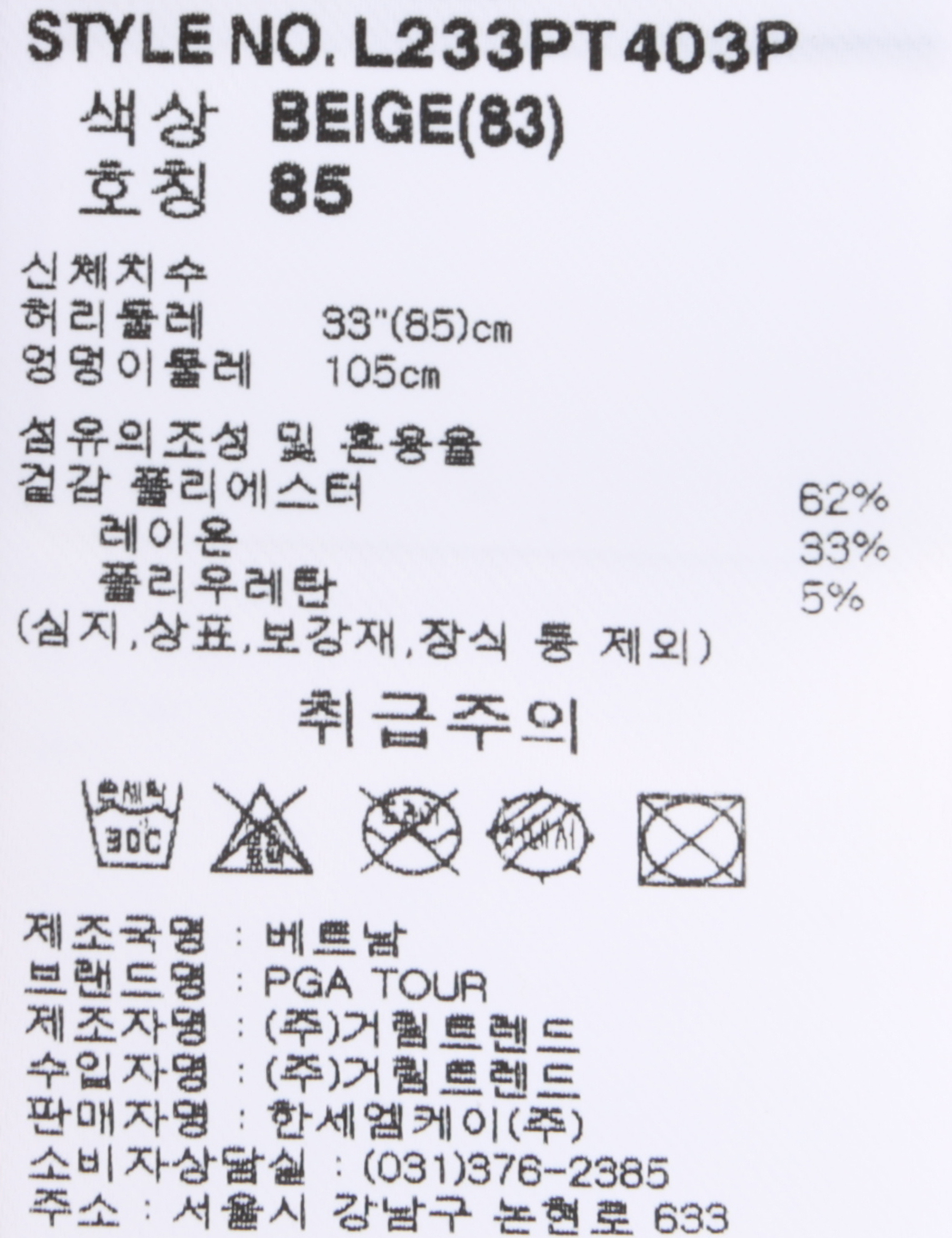 제품소재 [겉감]폴리에스터62% 레이온33% 폴리우레탄5%
