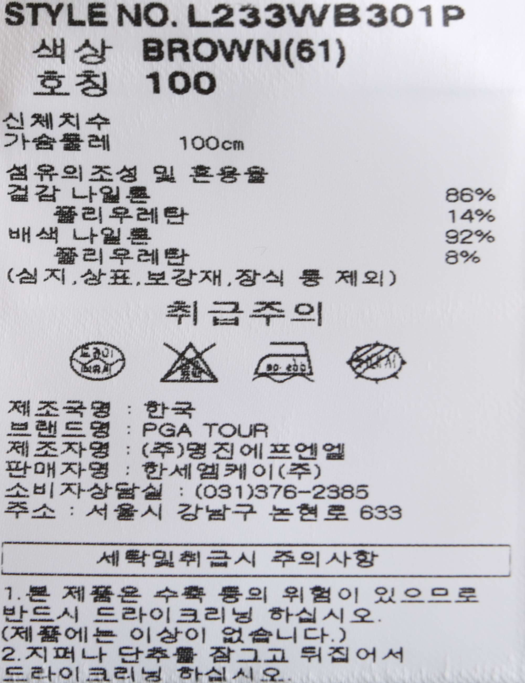 | 품질보증기준 | 본 제품은 반드시 드라이크리닝 하십시오.(세탁라벨참고) |