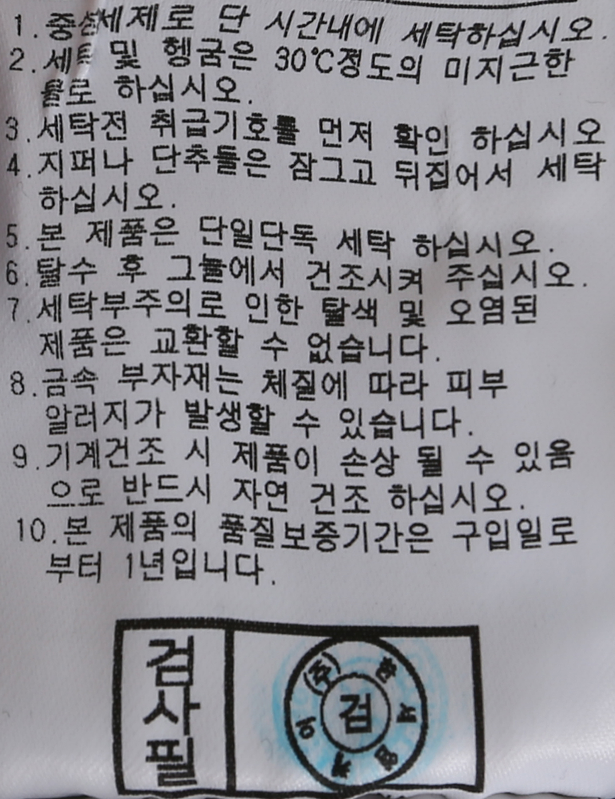 | 세탁방법 및 취급시 주의사항 | 본 제품은 손세탁 하십시오.(케어라벨참고) |