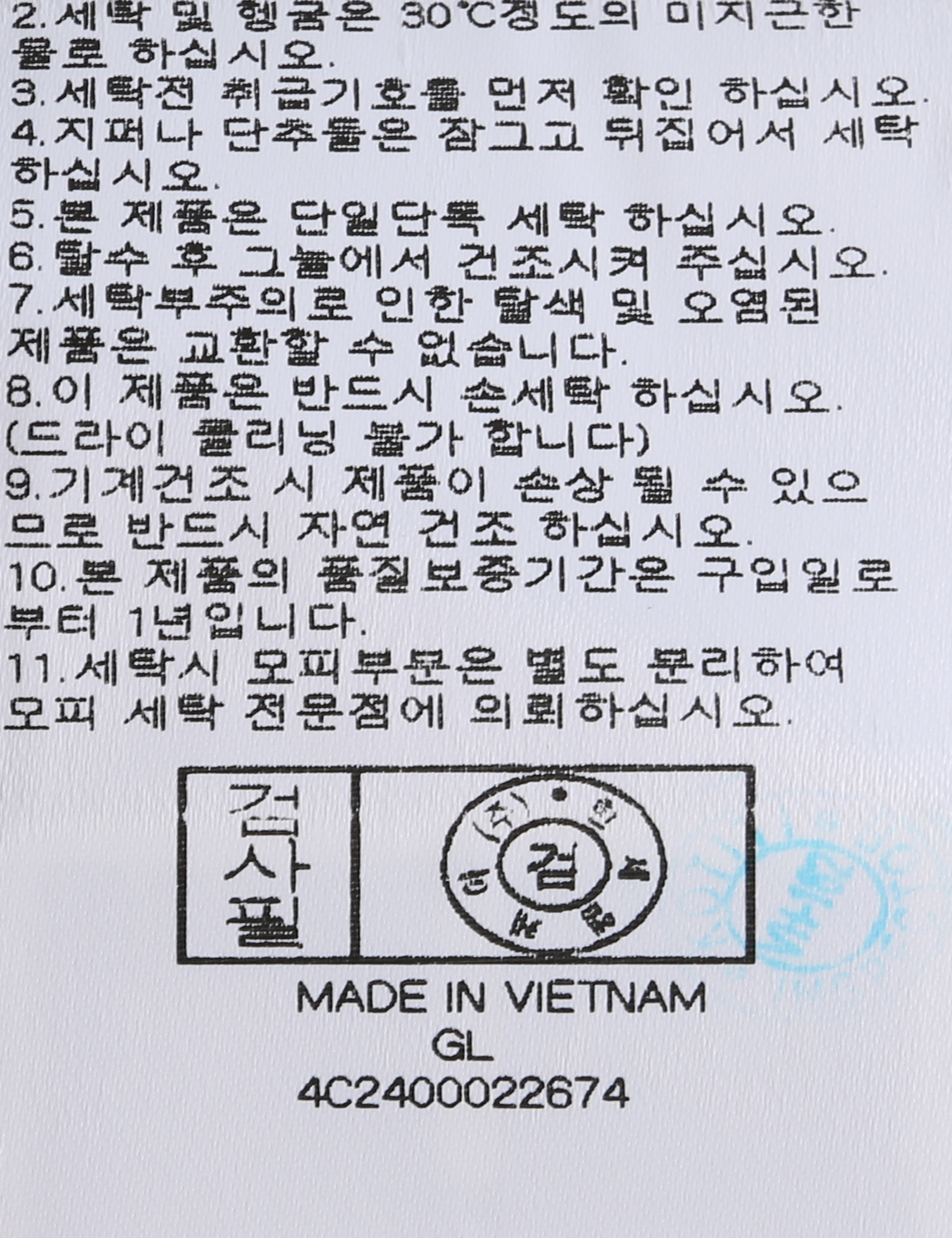 세탁방법 및 취급시 주의사항 본 제품은 손세탁 하십시오.(케어라벨참고)