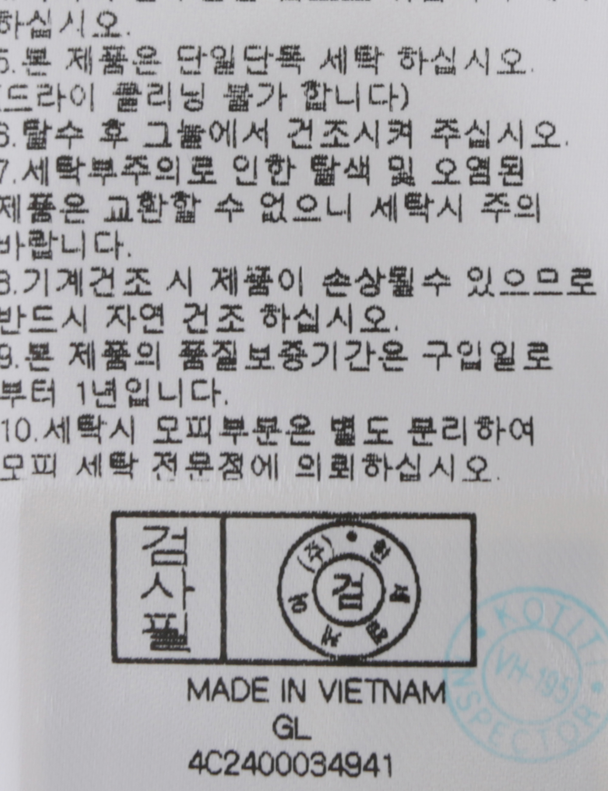 | 세탁방법 및 취급시 주의사항 | 중성세제로 단 시간내에 세탁하십시오.(케어라벨참고) |