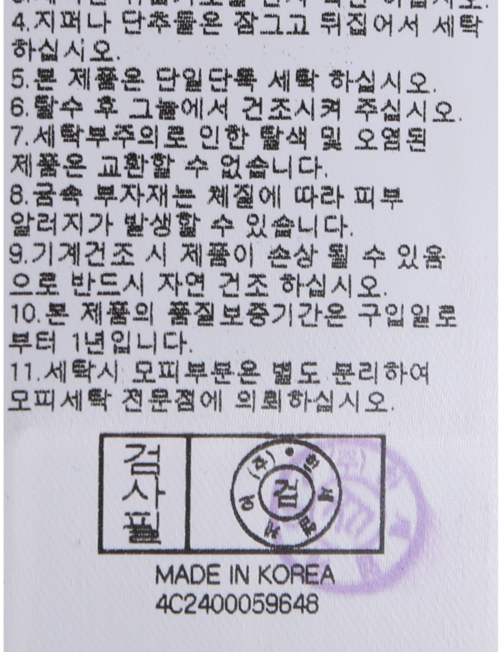 | 세탁방법 및 취급시 주의사항 | 본 제품은 손세탁 하십시오.(케어라벨참고) |