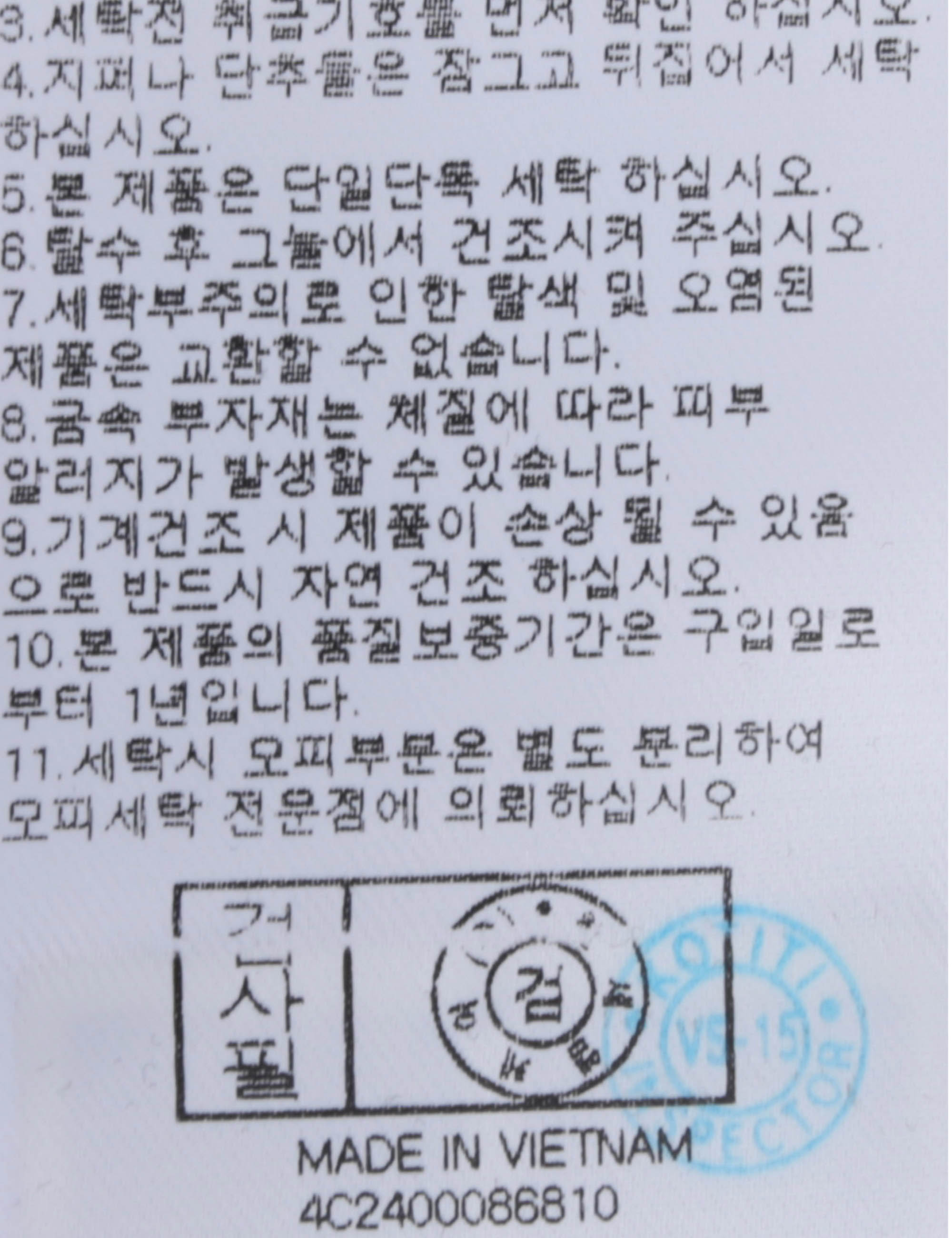 | 세탁방법 및 취급시 주의사항 | 본 제품은 손세탁 하십시오.(케어라벨참고) |