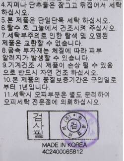 | 세탁방법 및 취급시 주의사항 | 본 제품은 손세탁 하십시오.(케어라벨참고) |