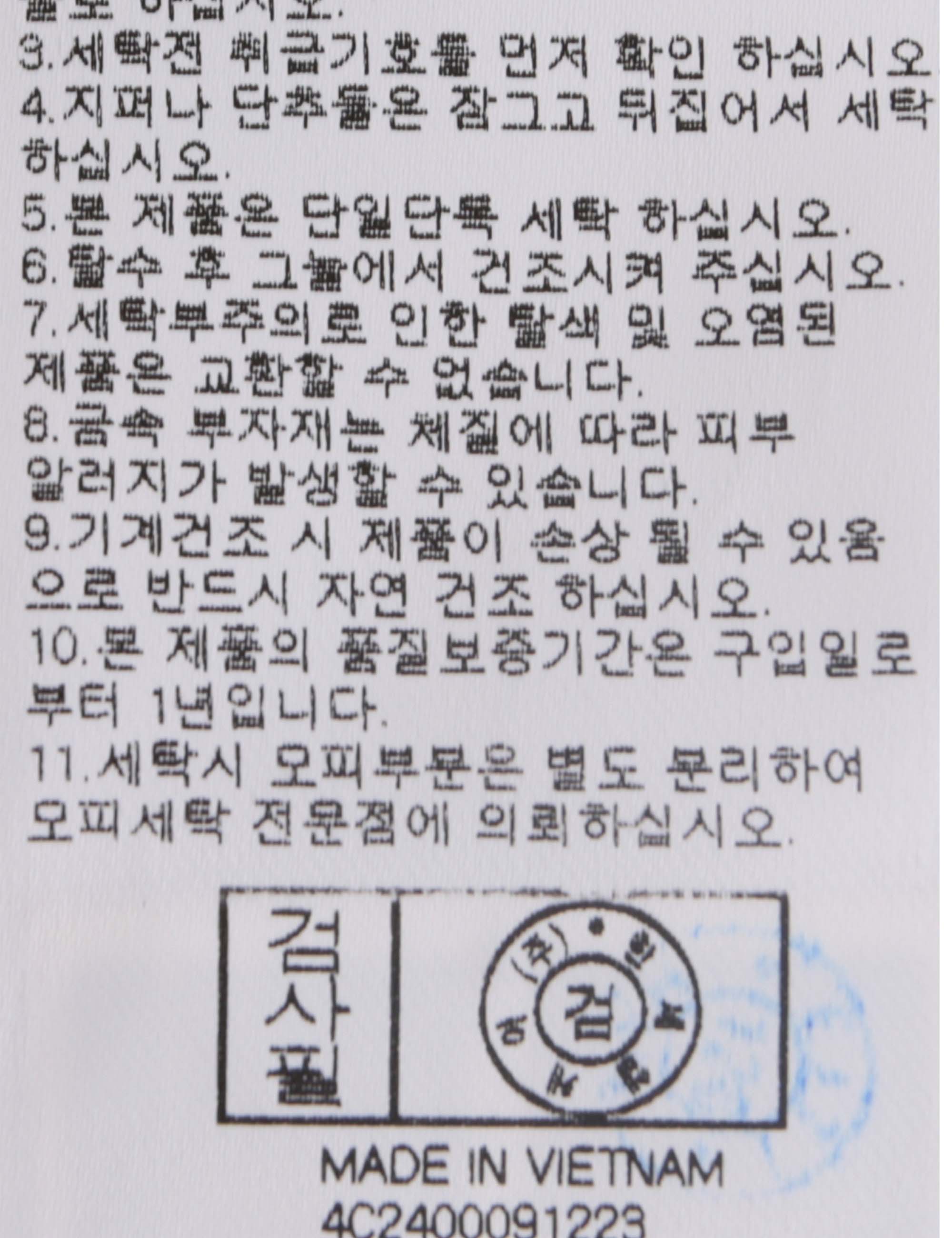 | 세탁방법 및 취급시 주의사항 | 본 제품은 손세탁 하십시오.(케어라벨참고) |