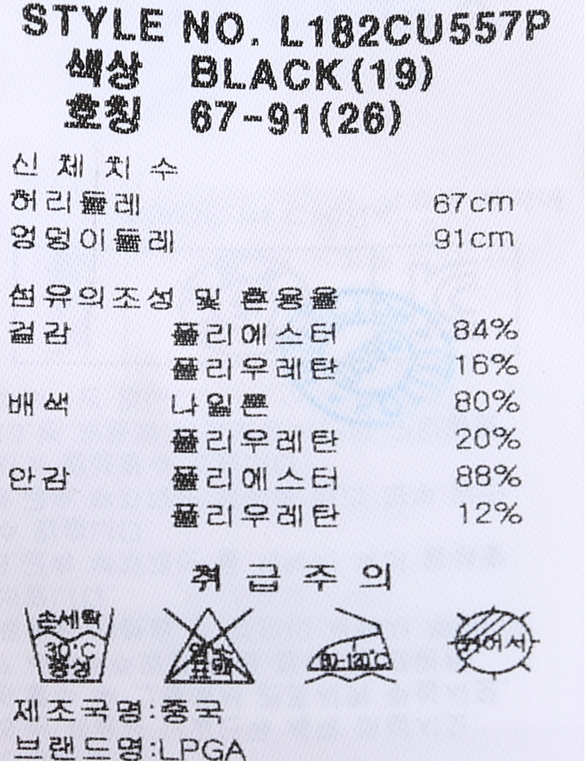 제품소재 [겉감]폴리에스터84% 폴리우레탄16% [배색]나일론80% 폴리우레탄20% [안감]폴리에스터88% 폴리우레탄12%