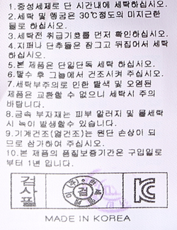 | 세탁방법 및 취급시 주의사항 | 본 제품은 손세탁 하십시오.(케어라벨참고) |