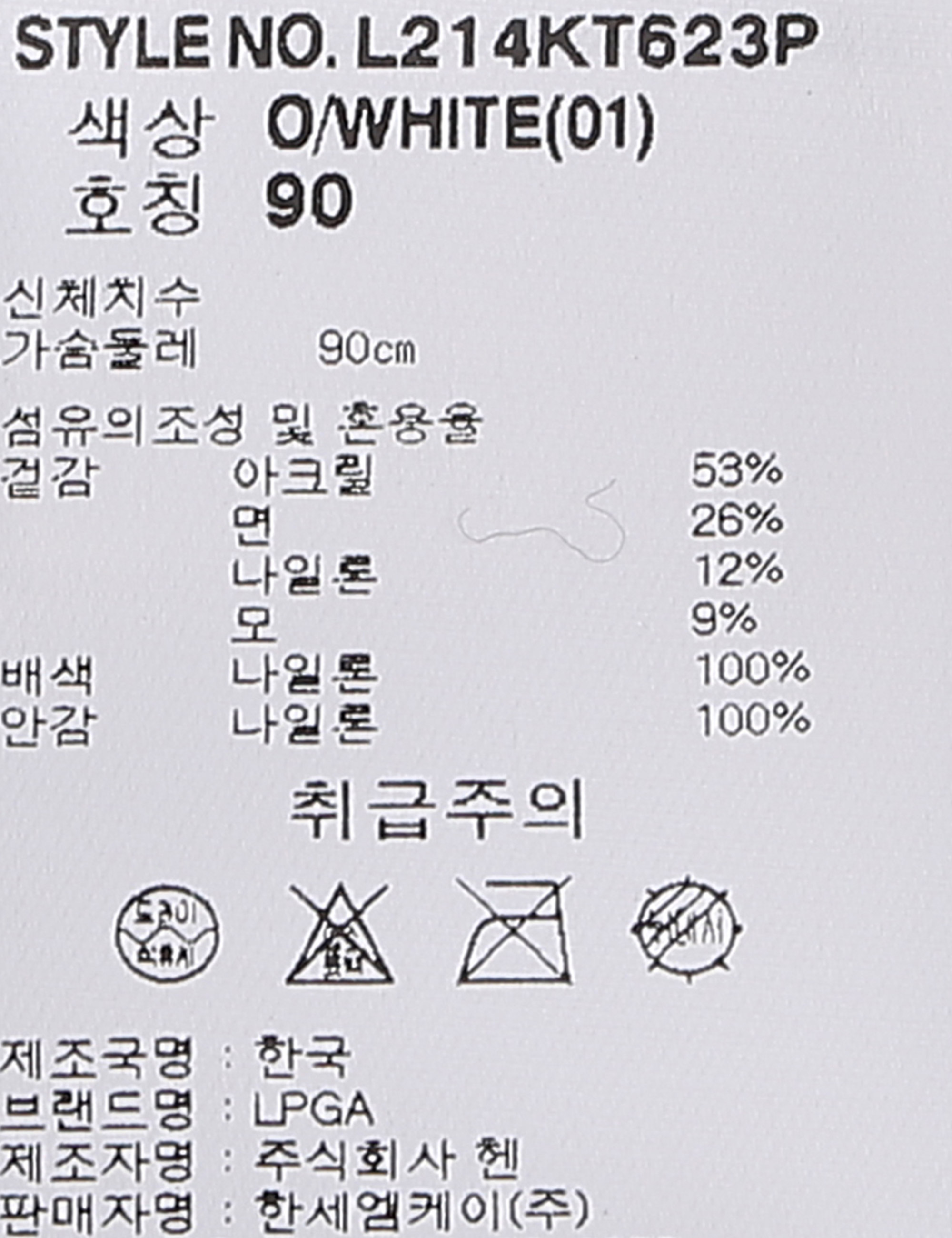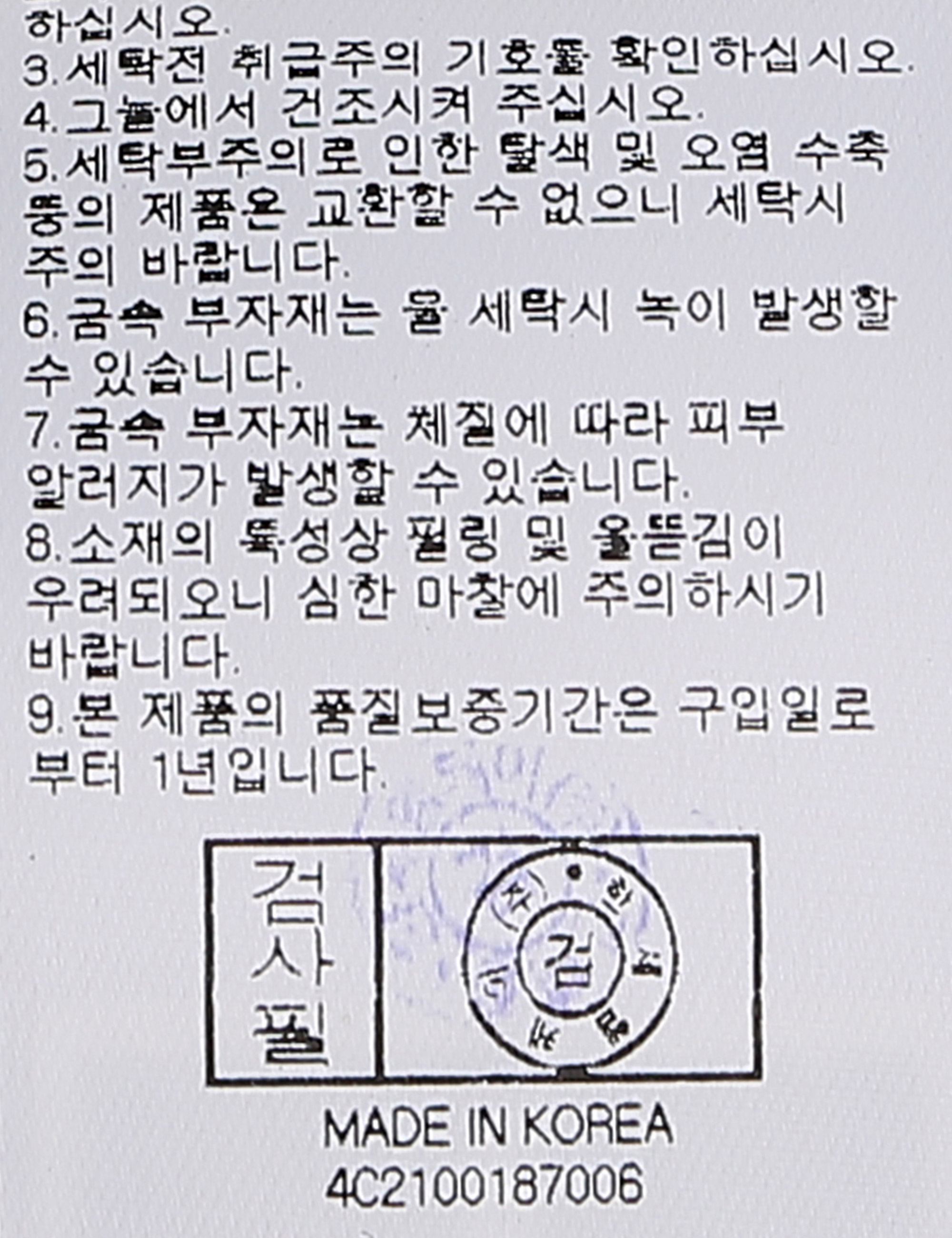 | 세탁방법 및 취급시 주의사항 | 본 제품은 반드시 드라이크리닝 하십시오.(세탁라벨참고) |