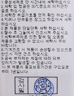 | 세탁방법 및 취급시 주의사항 | 본 제품은 손세탁 하십시오.(케어라벨참고) |