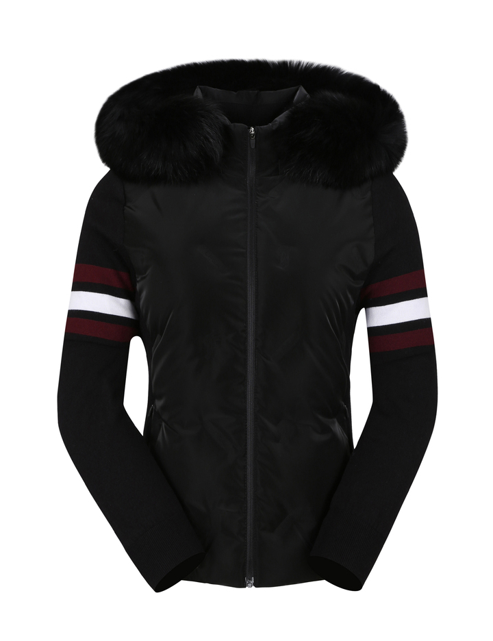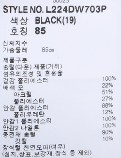 제품소재 [겉감]폴리에스터100% [배색]모22% 아크릴51% 폴리에스터27% [안감]폴리에스터88% 폴리우레탄12% [안감1]폴리에스터100% [안감2]나일론100% [충전재]거위솜털90% 거위깃털10% [장식털]천연모피(여우)