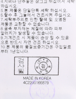 | 세탁방법 및 취급시 주의사항 | 본 제품은 손세탁 하십시오.(케어라벨참고) |