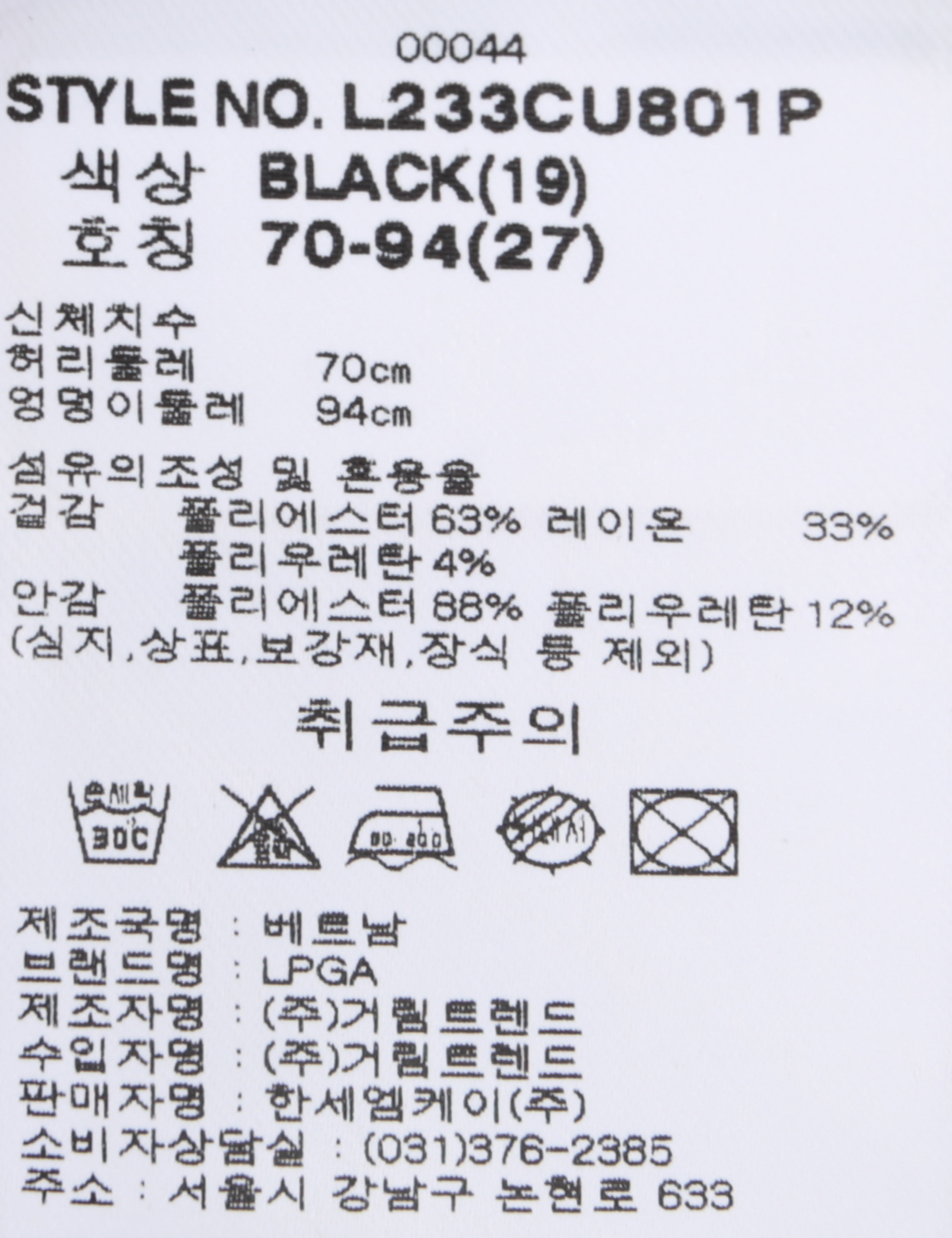 제품소재 [겉감]폴리에스터63% 레이온33% 폴리우레탄4% [안감]폴리에스터88% 폴리우레탄12%