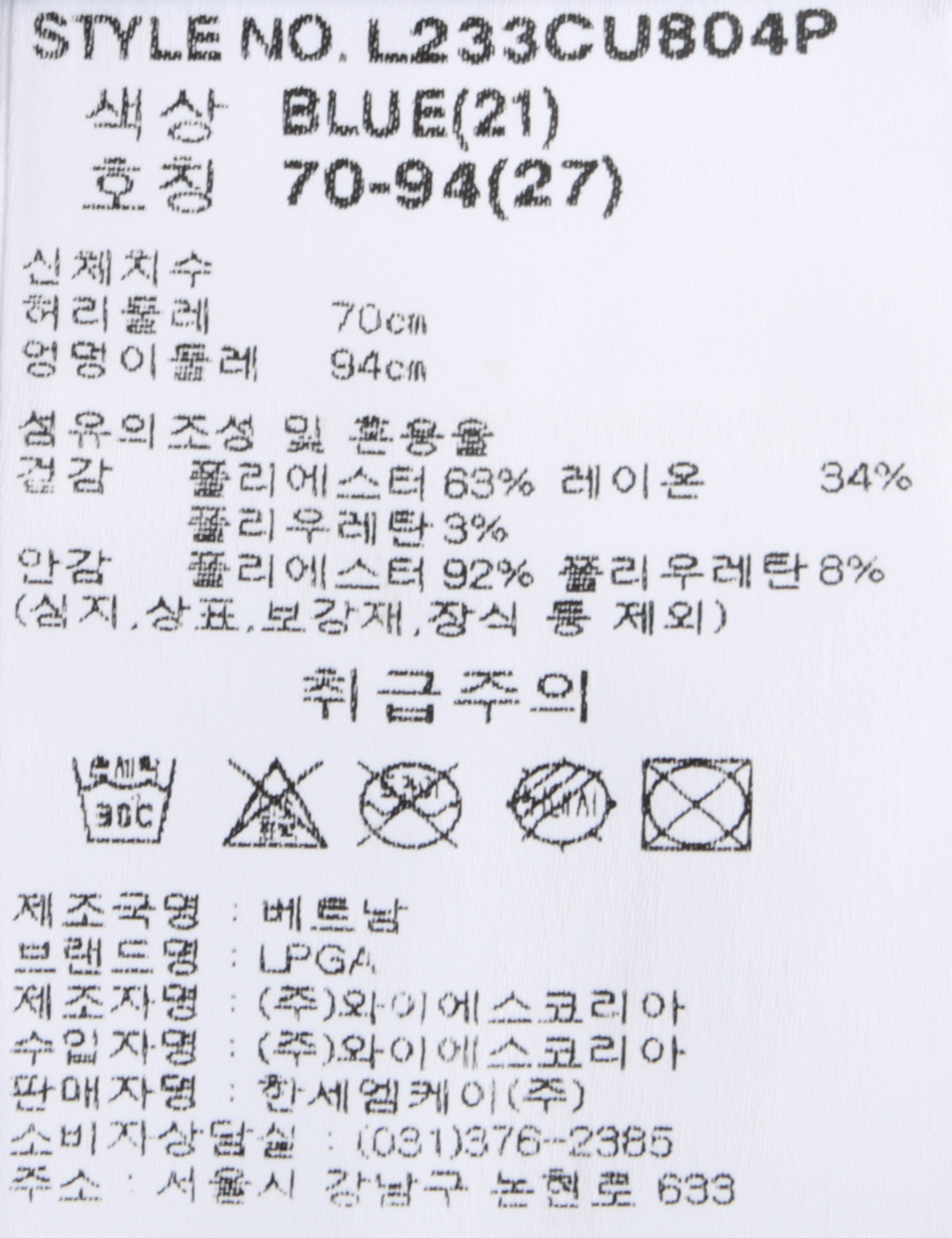 제품소재 [겉감]폴리에스터63% 레이온34% 폴리우레탄3% [안감]폴리에스터92% 폴리우레탄8%