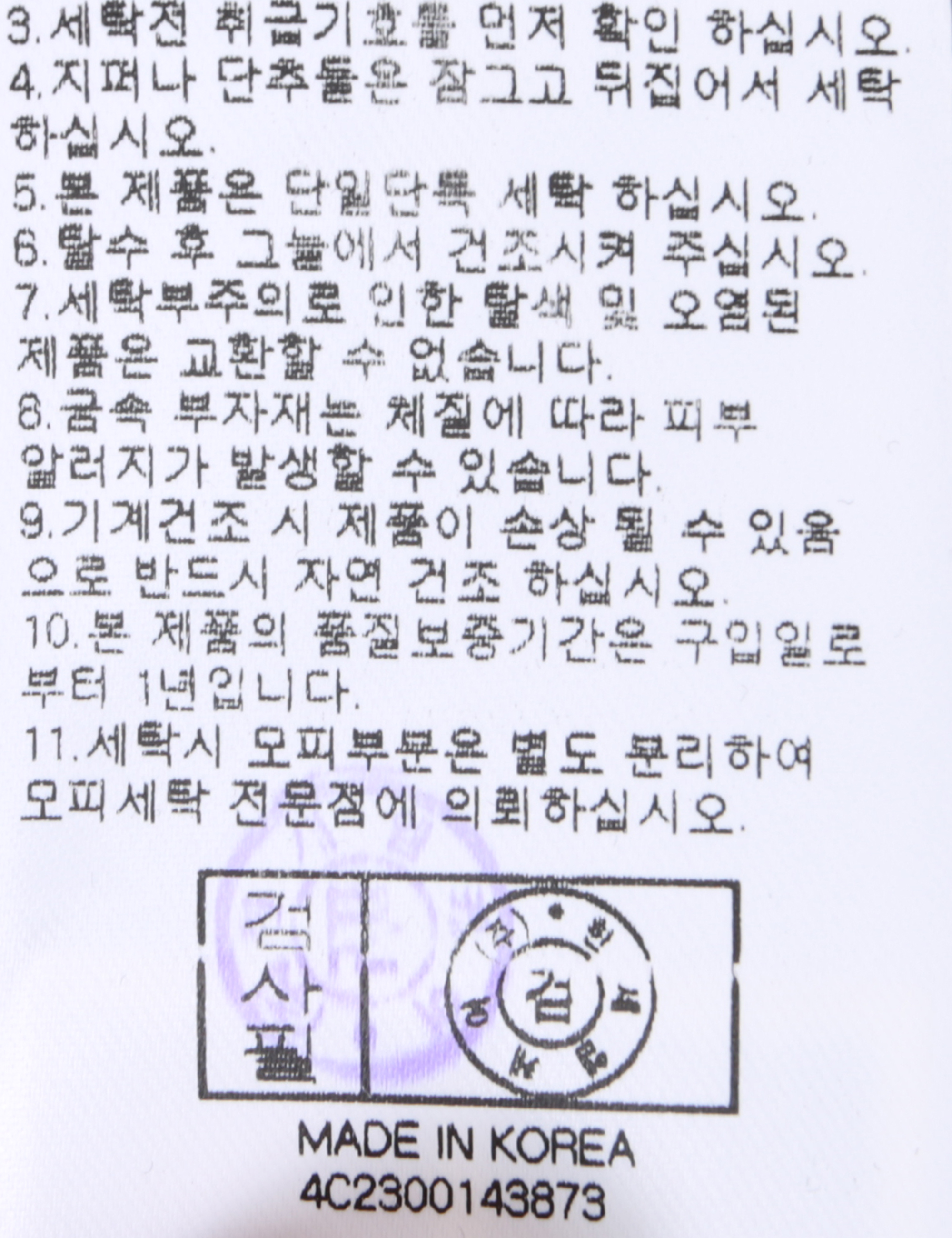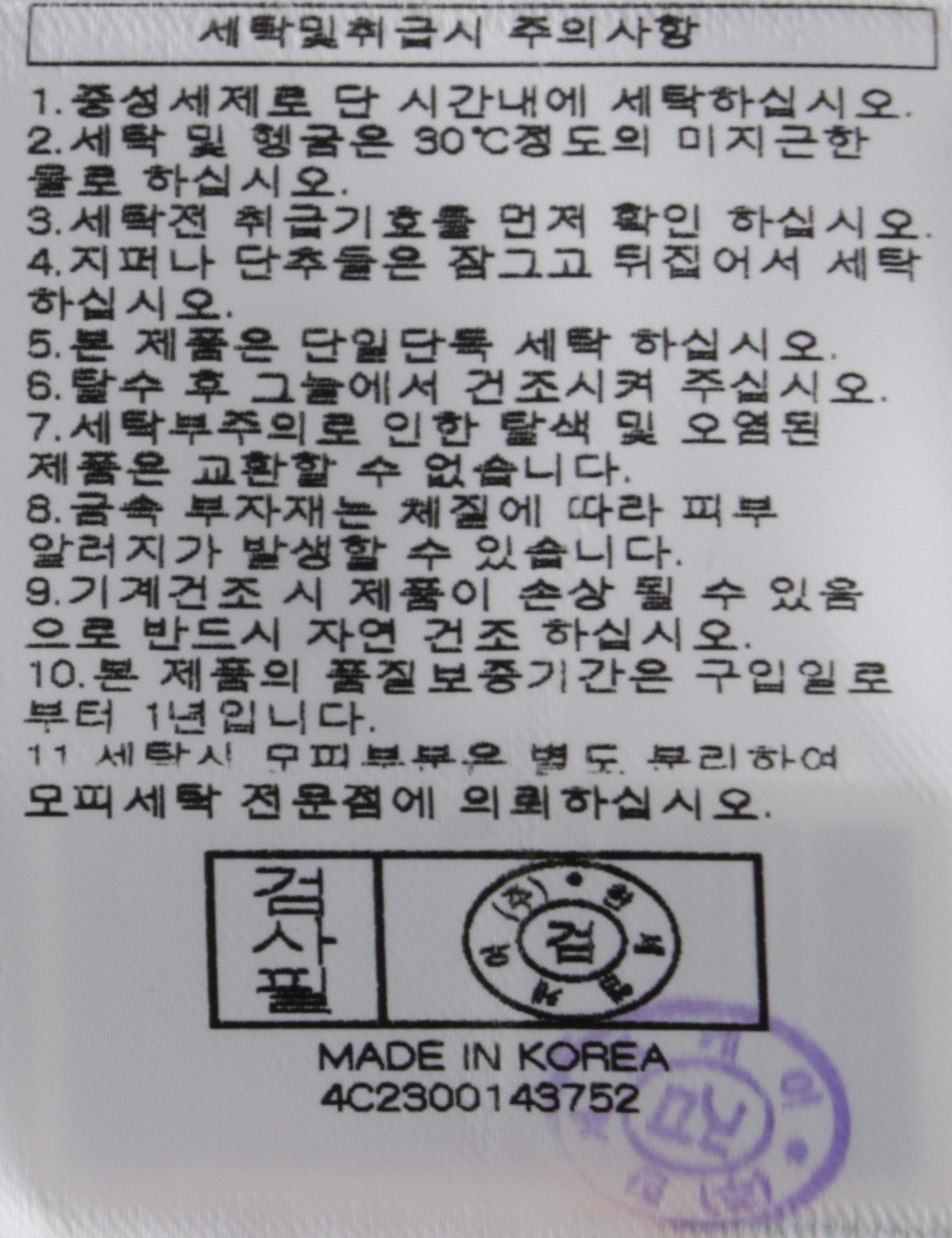 | 세탁방법 및 취급시 주의사항 | 본 제품은 손세탁 하십시오.(케어라벨참고) |