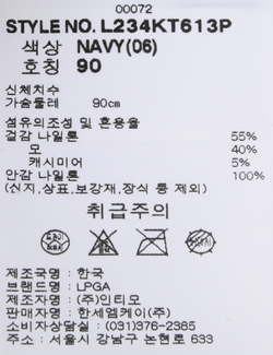 | 세탁방법 및 취급시 주의사항 | 본 제품은 반드시 드라이크리닝 하십시오.(세탁라벨참고) |